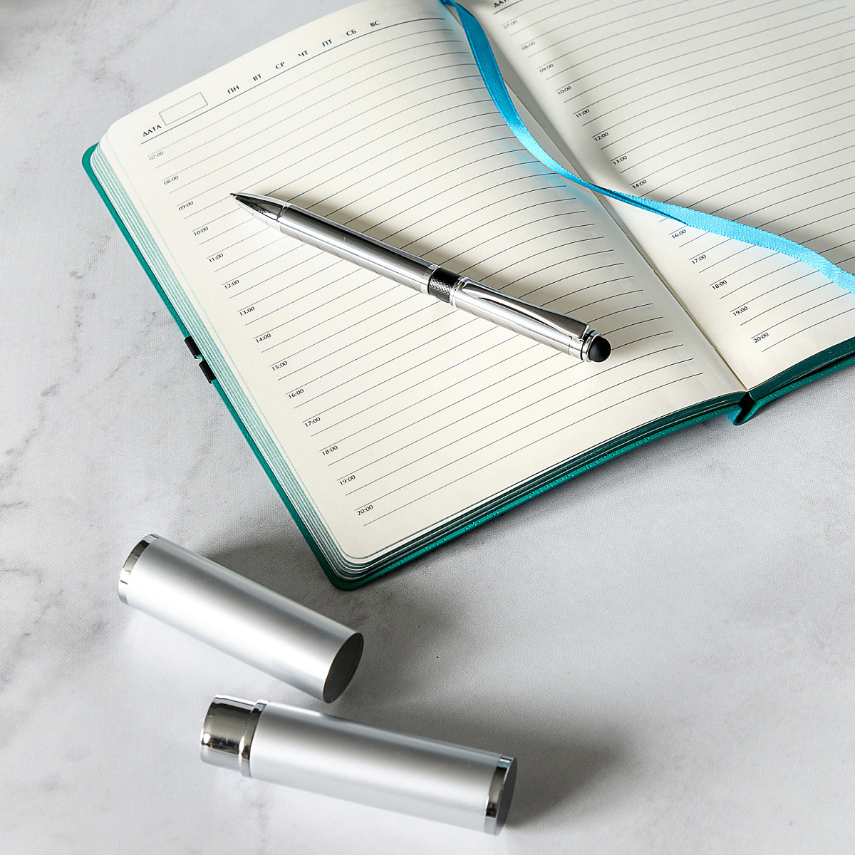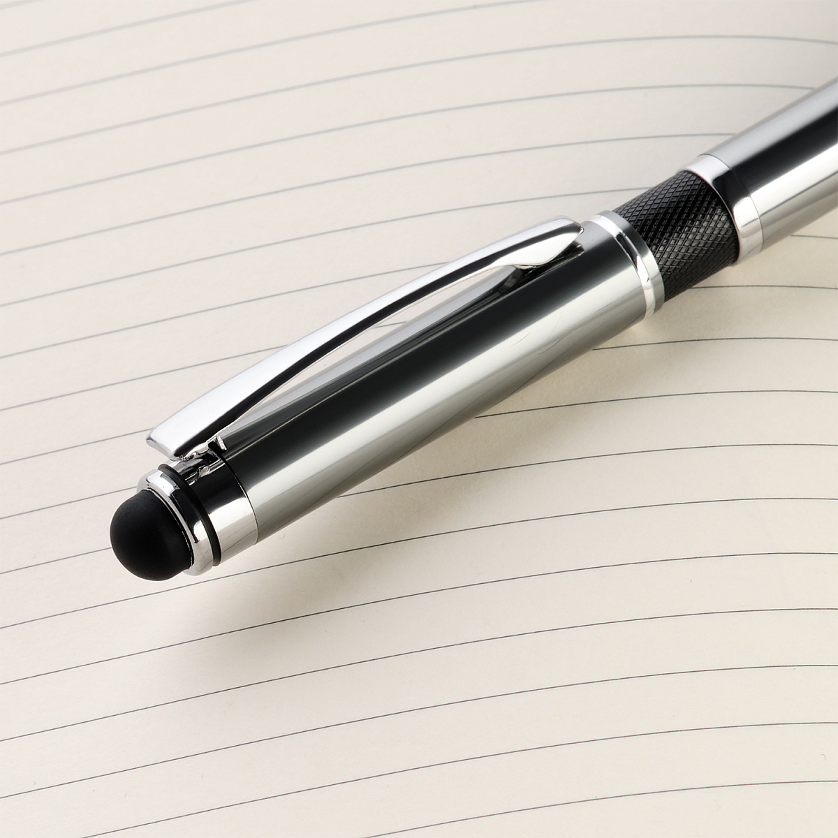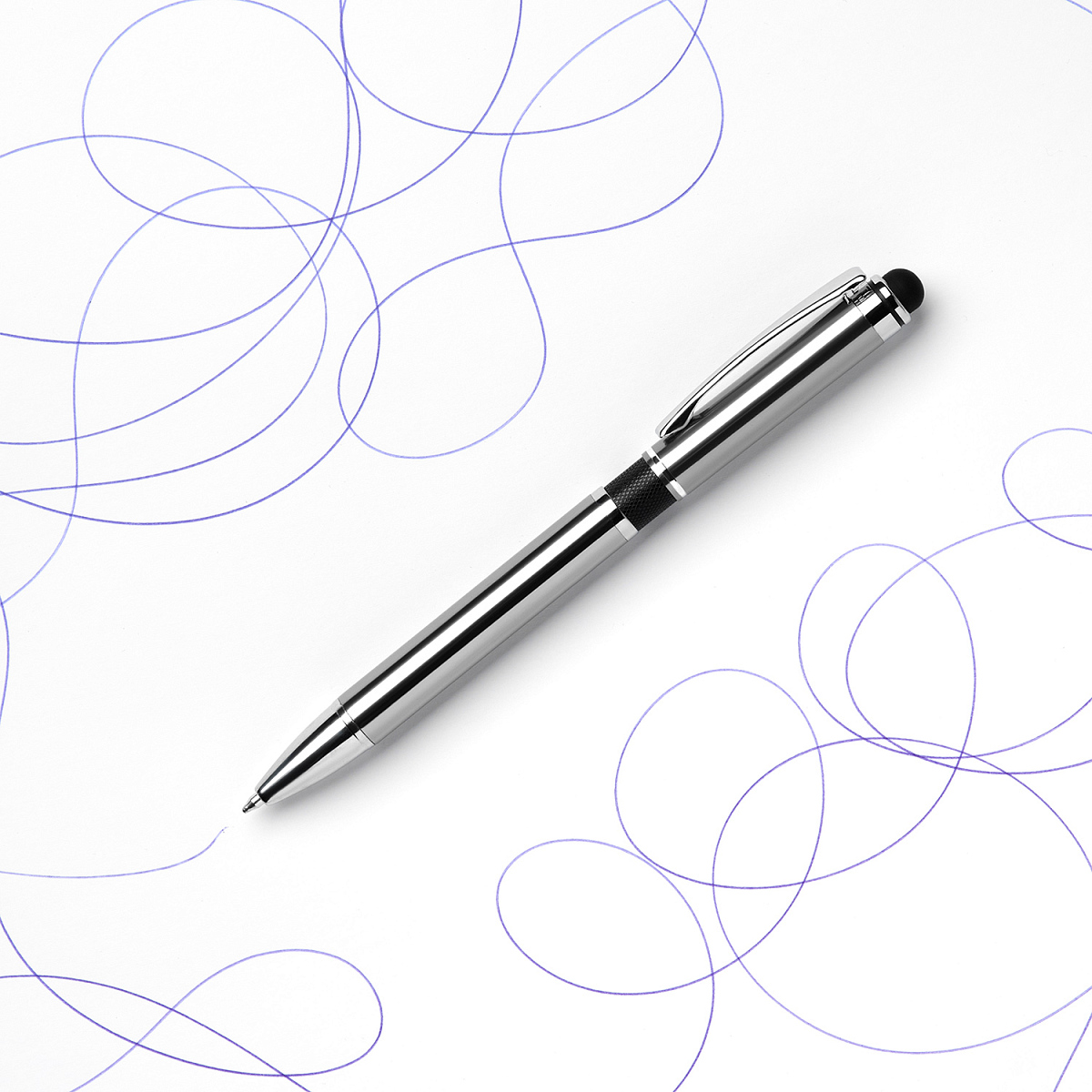 Классическая ручка цвета металлик с цветными деталями. Оснащена стилусом для работы с сенсорными экранами.