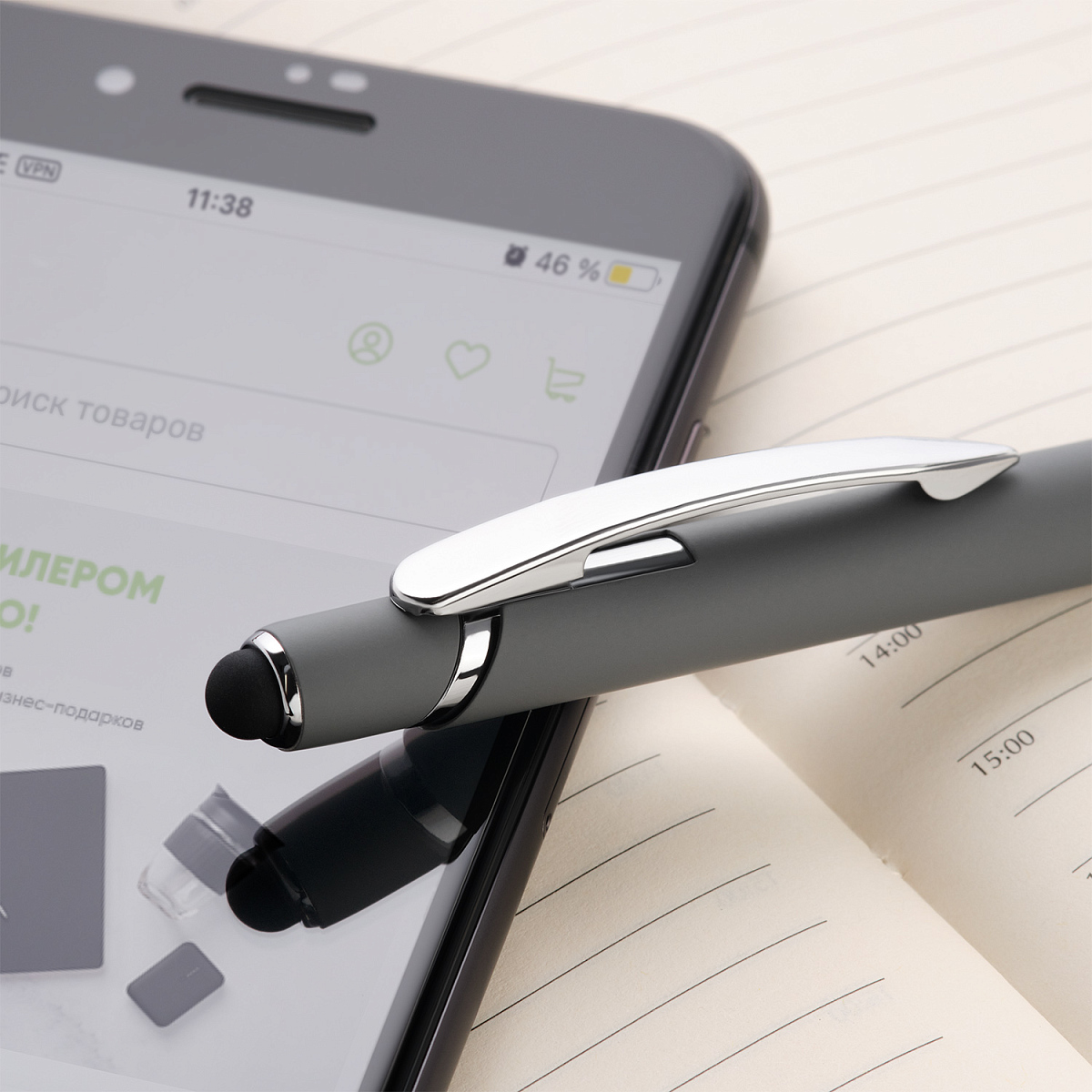 Отделка: хромированные детали, функциональный, надежный клип, оснащен стилусом для работы с сенсорными экранами