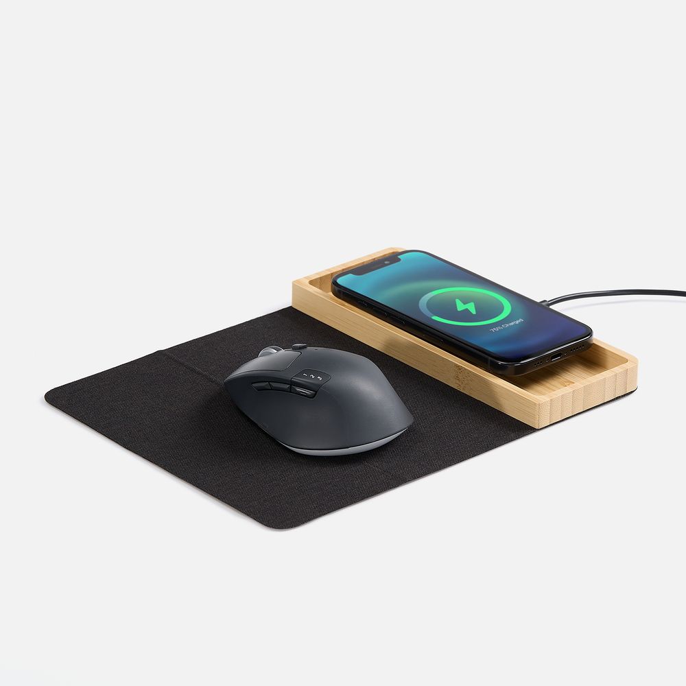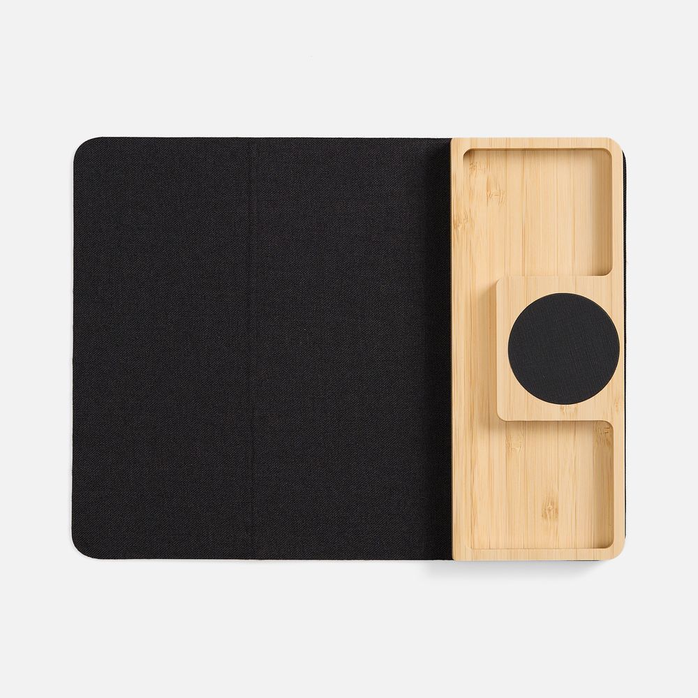 Midstream — это коврик для мышки с площадкой для беспроводной зарядки и отсеком для канцелярских принадлежностей. Его можно использовать как на работе, так и в дороге или на встречах: коврик компактно складывается и не занимает много места в сумке для ноутбука.