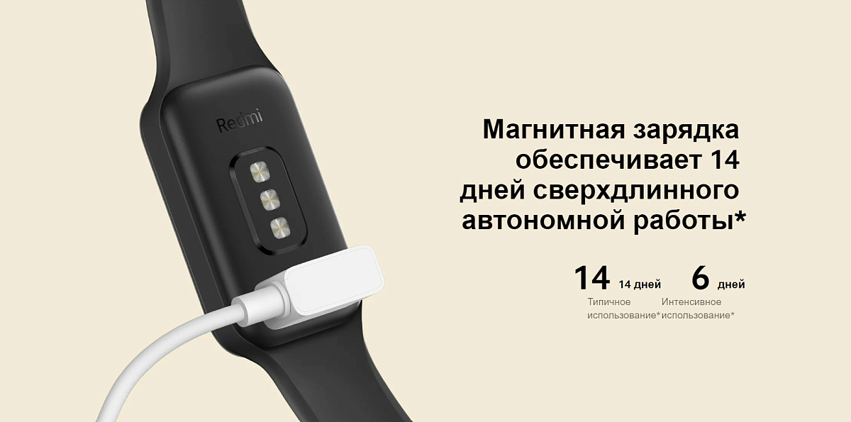 Особенности: аккумулятор 210 мАч; зарядка через магнитный коннектор; класс защиты от воды 5 АТМ; отслеживание более 30 видов физической активности; максимальная яркость 450 нит; Bluetooth 5.1 BLE