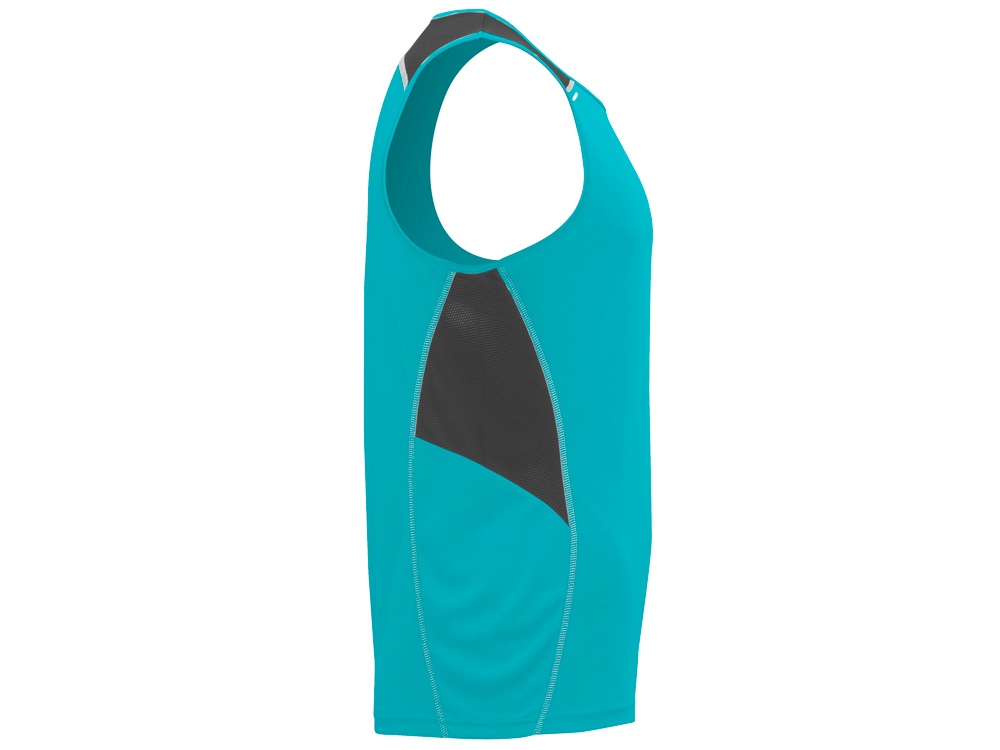 Спортивная майка со светоотражающими деталями. Круглый вырез горловины укреплен декоративной строчкой. Комбинация двух полиэстеровых полотен: основное полотно интерлок, боковые и верхние вставки из микроперфорированного полотна для повышенной воздухопроницаемости. Технологичное полотно быстро сохнет.
