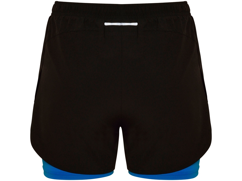 Женские спортивные шорты с контрастными внутренними короткими легинсами. Эластичный пояс с внутренним шнурком для регулировки. Светоотражающие детали. Специальная эластичная ткань для бега.