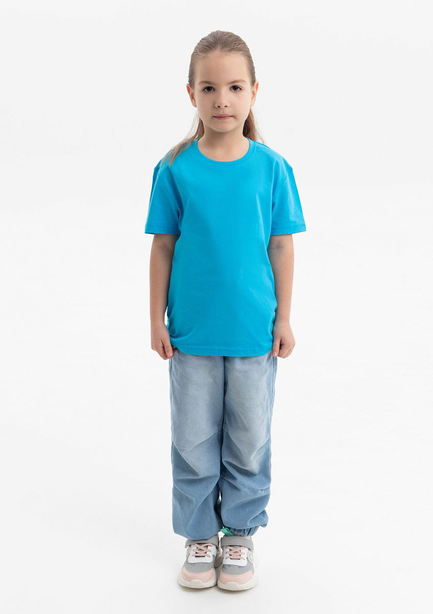 Детская футболка свободного силуэта с округлым воротом и втачным рукавом. Плечевые швы и шов горловины спинки усилены настрочной бейкой из основного полотна.
