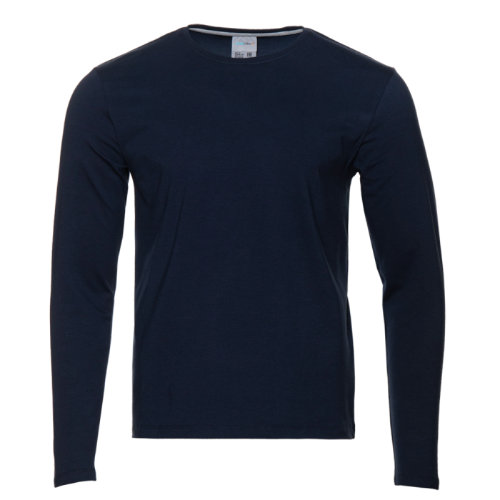 Универсальная футболка прямого силуэта с округлым воротом и длинным втачным рукавом. Плечевые швы и шов горловины усилены настрочной бейкой из основного полотна.