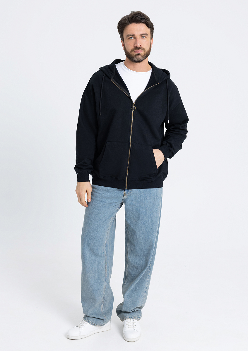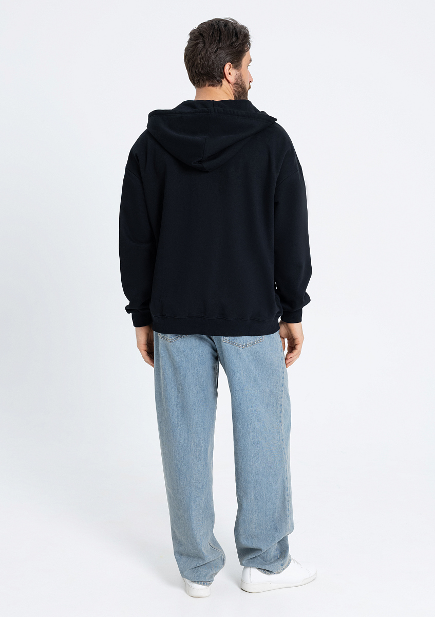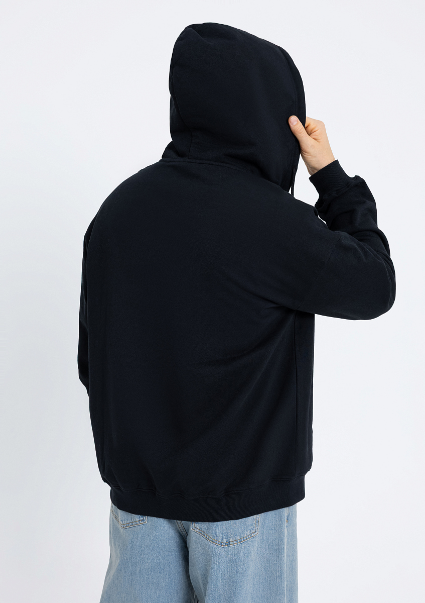 Толстовка силуэта oversize с капюшоном комфортной глубины, спущенной линией плеча и глубоким карманом. Крой дополнен акцентной молнией, а горловина и спинка модели укреплены киперной тесьмой.