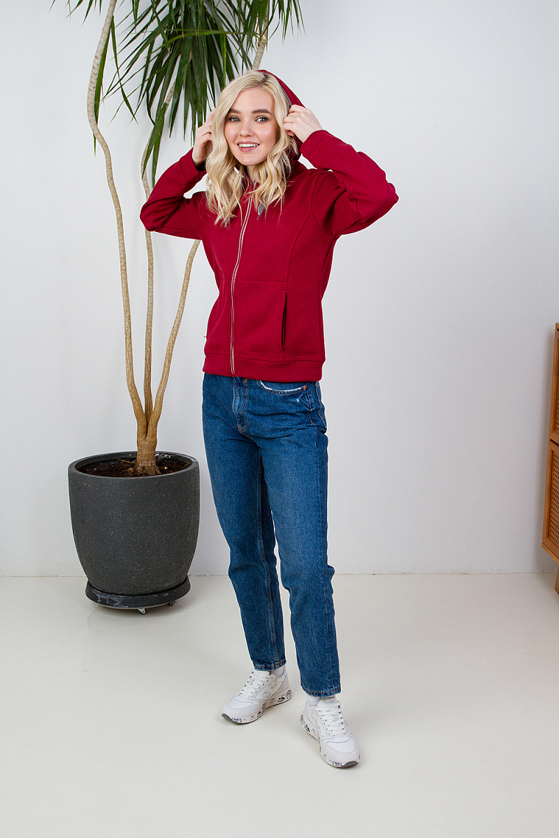 Женская толстовка прямого силуэта с капюшоном комфортной глубины, втачным рукавом, прорезным карманов и застежкой на контрастную молнию. Капюшон дополнен плоским шнурком для регулировки прилегания, манжет и низ изделия выполнены из основного полотна.