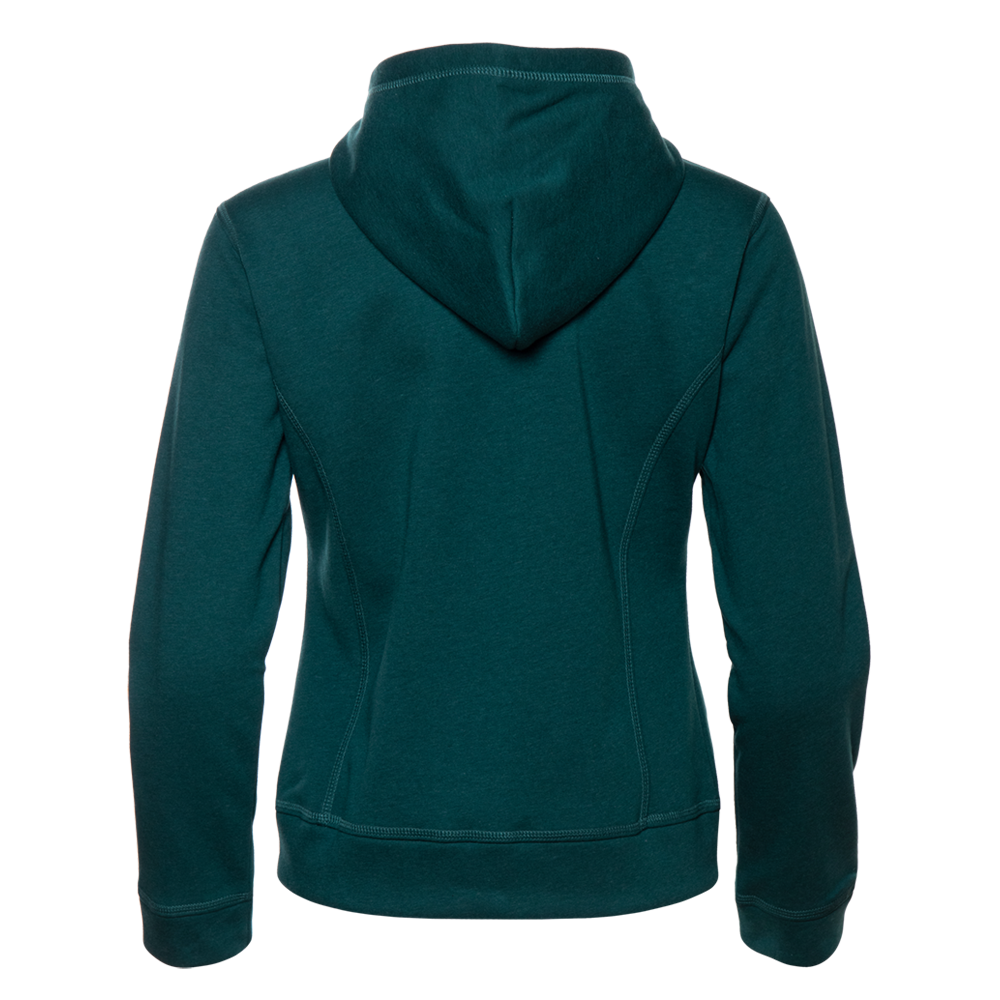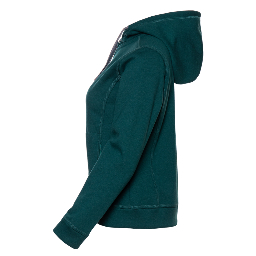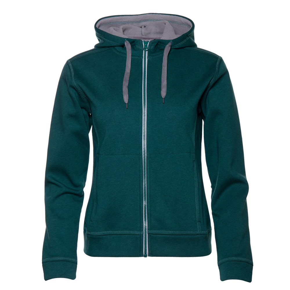 Женская толстовка прямого силуэта с капюшоном комфортной глубины, втачным рукавом, прорезным карманов и застежкой на контрастную молнию. Капюшон дополнен плоским шнурком для регулировки прилегания, манжет и низ изделия выполнены из основного полотна.