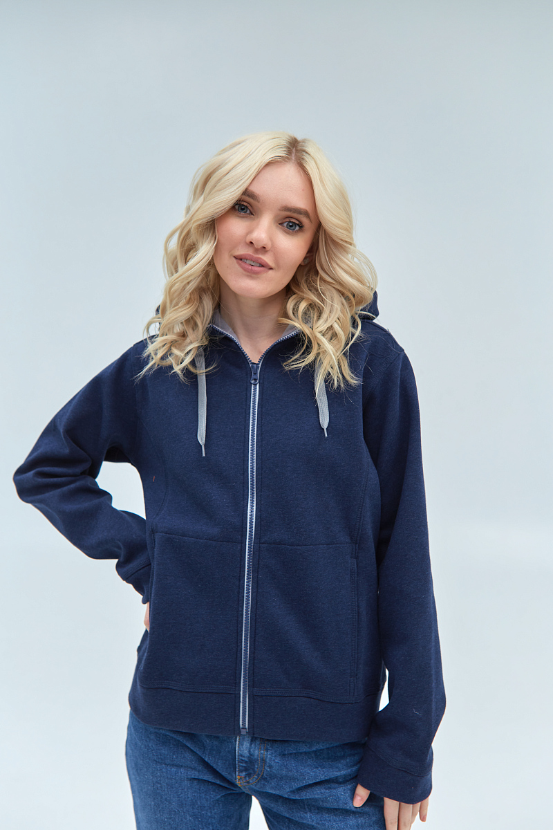 Женская толстовка прямого силуэта с капюшоном комфортной глубины, втачным рукавом, прорезным карманов и застежкой на контрастную молнию. Капюшон дополнен плоским шнурком для регулировки прилегания, манжет и низ изделия выполнены из основного полотна.