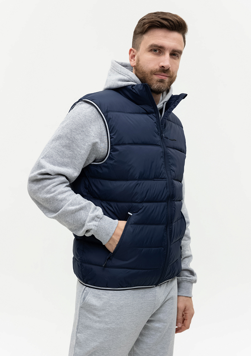 Мужской жилет прямого силуэта с геометричной стежкой, воротником-стойкой, прорезным карманом и застежкой на молнию. Изделие дополнено контрастной резинкой по пройме и линии низа для дополнительной защиты от холода и ветра.