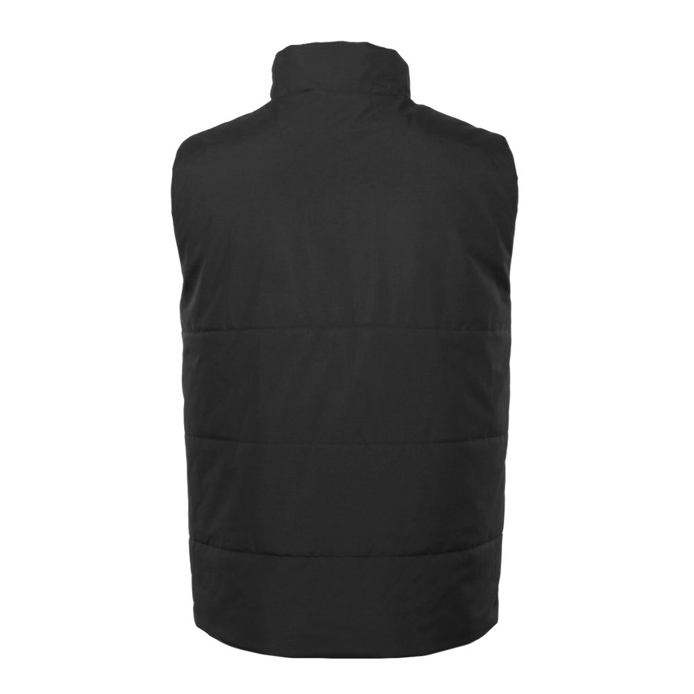 Утеплённый жилет полуприлегающего силуэта с воротником стойкой, центральной застежкой на молнию в тон основному полотну и прорезным карманом с листочкой. Подклад выполнен в цвет основного материала, утеплитель надежно зафиксирован прострочкой по груди и спинке.