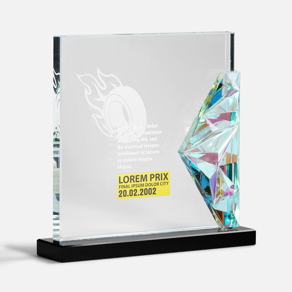Evergleam — оригинальное исполнение традиционной стелы с эффектной цветной вставкой. Эта переливающаяся разными оттенками объемная деталь, словно какой-то фантастический кристалл, добавляет привычной награде магии и свежести, олицетворяя драгоценность признанного успеха и высокое мастерство самого получателя.