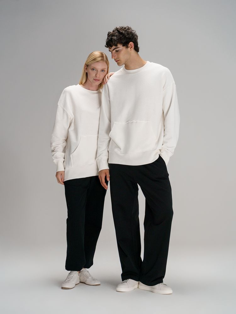 Благодаря особой конструкции, где часть деталей — перед и спинка — вывернута наизнанку, свитшот приобретает запоминающийся вид. Так внутренняя, обычно незаметная сторона материала превращается в лицевую: миниатюрные петельки бывшей изнанки становятся настоящим украшением толстовки, добавляя ей оригинальности и эффект невероятно приятной плюшевости.