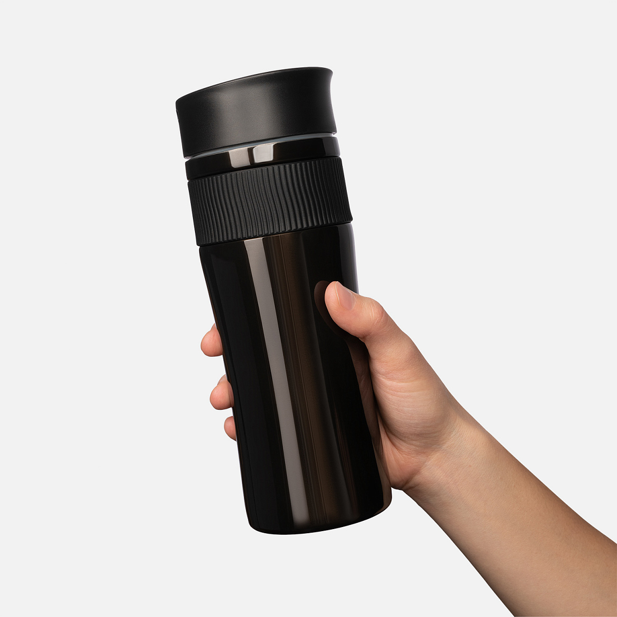 Термокружка с системой OneHand Open позволяет пользоваться кружкой одной рукой. Силиконовый манжет на корпусе не позволит кружке выскочить из руки в самый не подходящий момент.