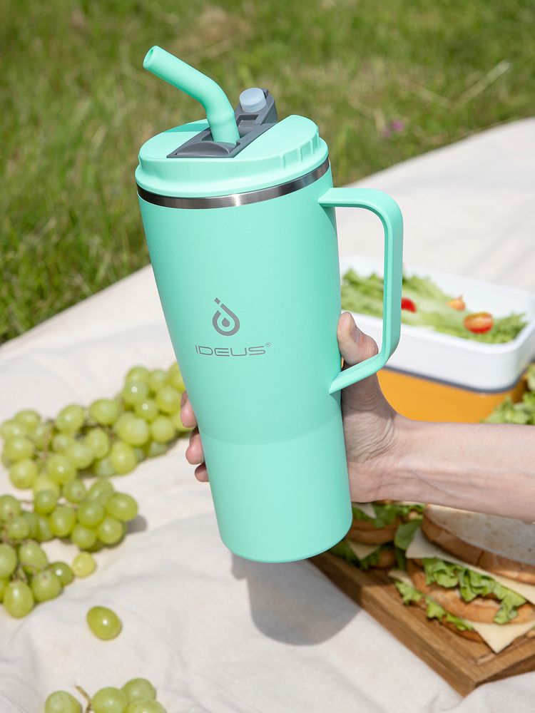 - 2 крышки в комплекте: одна на 100% герметичная с механизмом блокировки отверстия для питья, вторая — с отверстием для трубочки