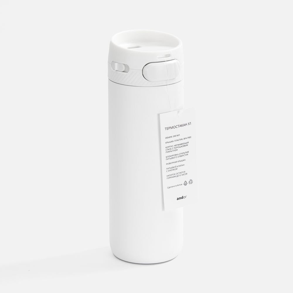 Специально спроектированная конструкция термостакана Andor со съемной кнопкой и отверстием для подвеса на крышке открывает простор для различных вариантов кастомизации и нанесения изображений. На изделии и упаковке нет айдентики бренда, а название бренда с картонного лейбла легко удалить.