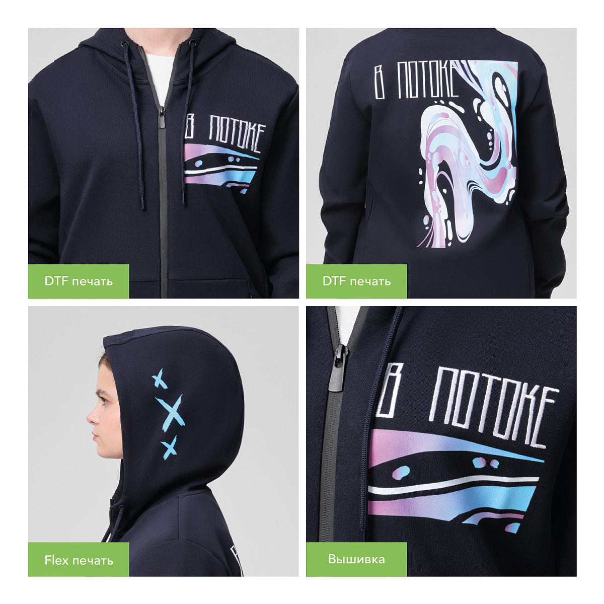 Толстовка сделана из мягкой и прочной ткани интерлок "doubleface", которая приятна к телу и легка в уходе, не растягивается, не выцветает и не деформируется после стирки. Манжеты и низ сделаны из плотной резинки 2х2, благодаря чему вещь держит форму. Карманы на потайных молниях придают толстовке аккуратный вид. Капюшон на подкладке из ткани джерси в тон регулируется шнурками.