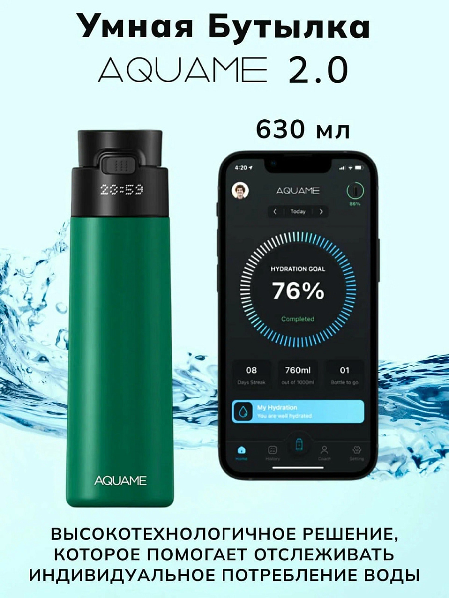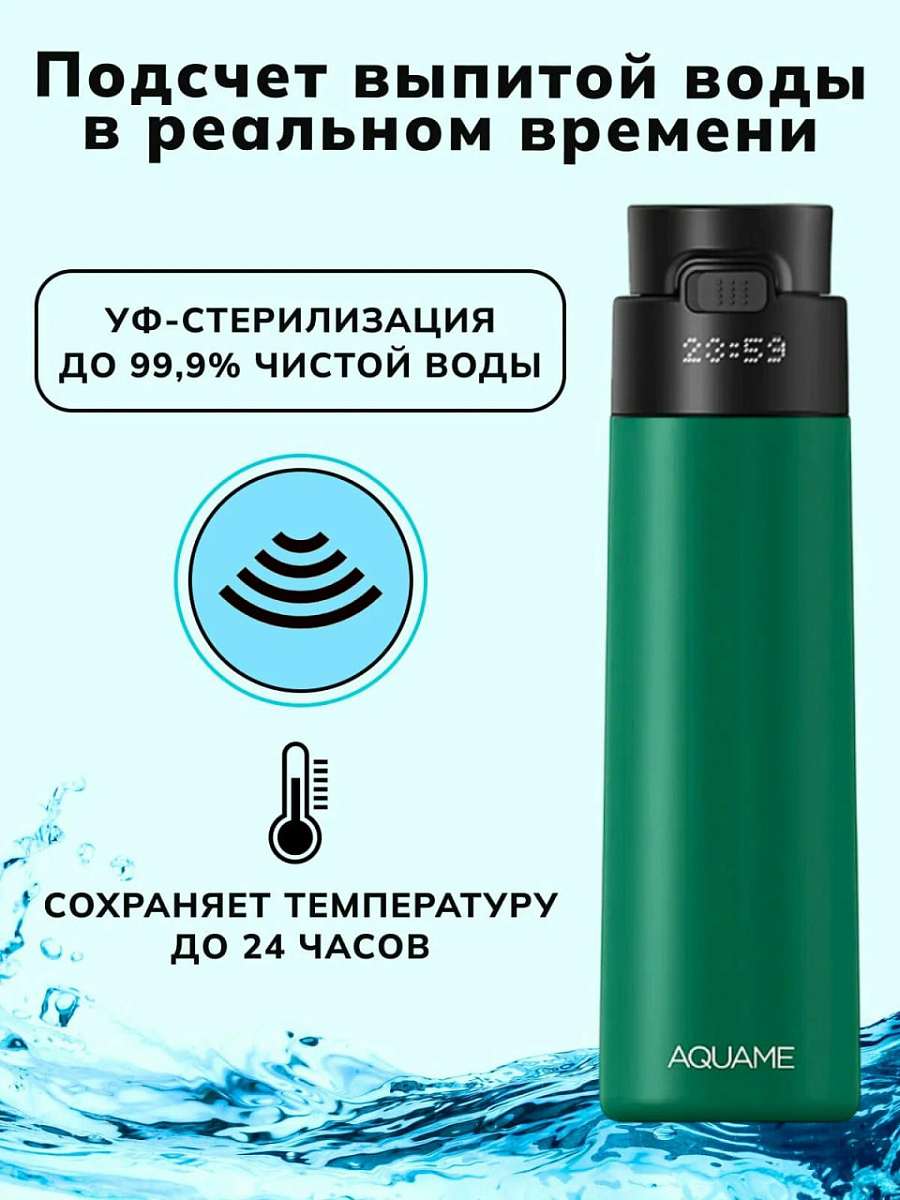 Особенности: уникальная умная бутылка для воды с функцией трекинга гидратации на базе искусственного интеллекта; функция термоса: поддержка температуры до 18-24 часов; гипоаллергенная УФ-стерилизация очищает воду до 99.9% без использования химикатов, гарантируя безопасность даже в дороге; функция напоминания выпить воды; светодиодный дисплей с функцией отображения заряда батареи, времени, температуры жидкости и функции УФ-стерилизации; время зарядки до 8 часов; заряда хватает на 15+ дней; собственное приложение для тонкой настройки своего потребления воды