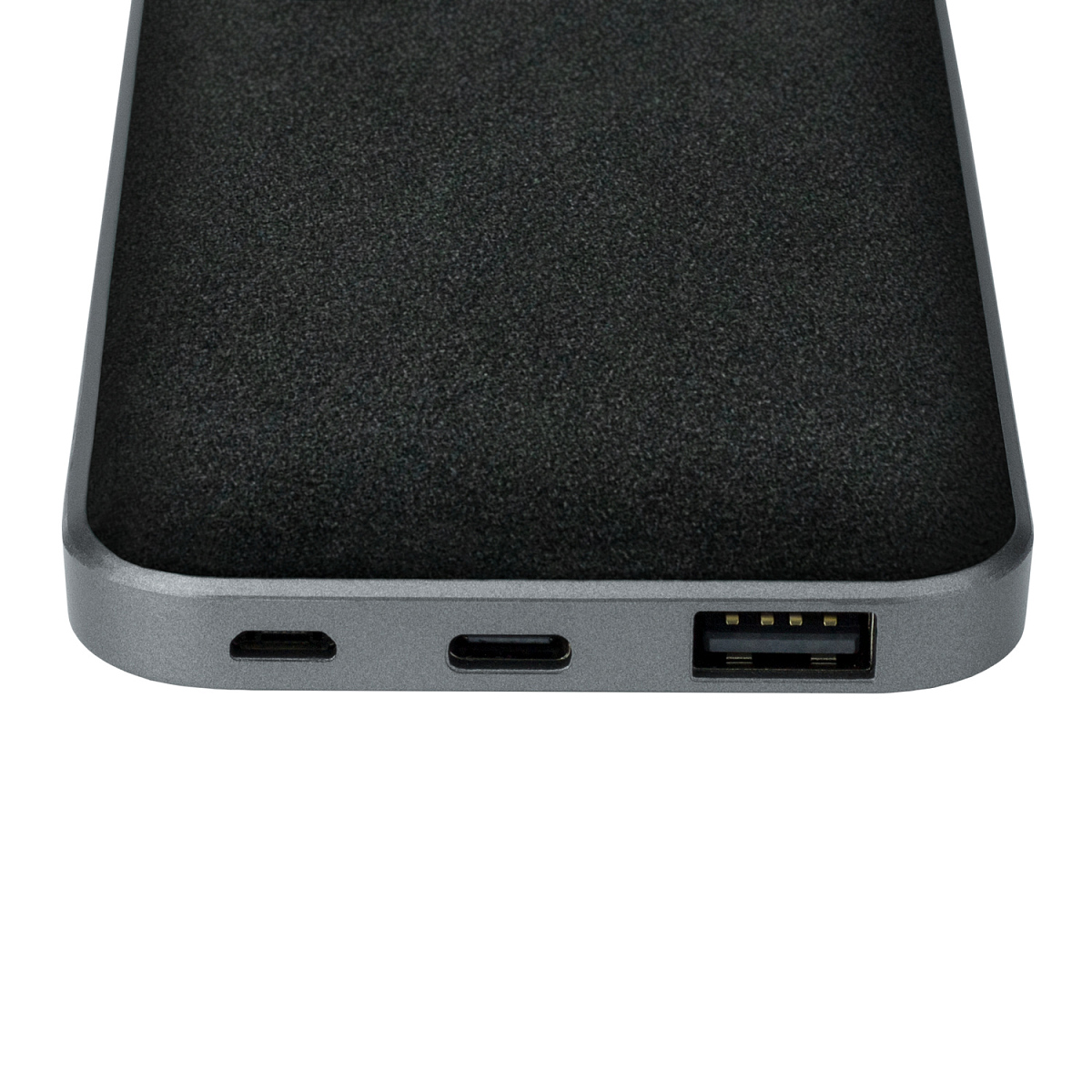 Яркий аккумулятор In Velour - отличная пара ежедневнику одноименной коллекции. Материал устройства приятен к рукам: бархатистая поверхность и плавные линии корпуса дарят комфорт при использовании. Стильный дизайн обеспечивается грамотным сочетанием основных элементов корпуса с боковой панелью. Внешне напоминая велюр, корпус гаджета выполнен в насыщенном бирюзовом цвете, вкрапления которого плавно переходят от темных тонов к более светлым. Боковая панель из пластика серого матового металлика включает в себя индикатор питания, а также порты USB, micro-USB и Type-C. Конструкция аккумулятора позволяет использовать обе стороны для персонализации, что дает новые возможности для воплощения идеи дизайна.