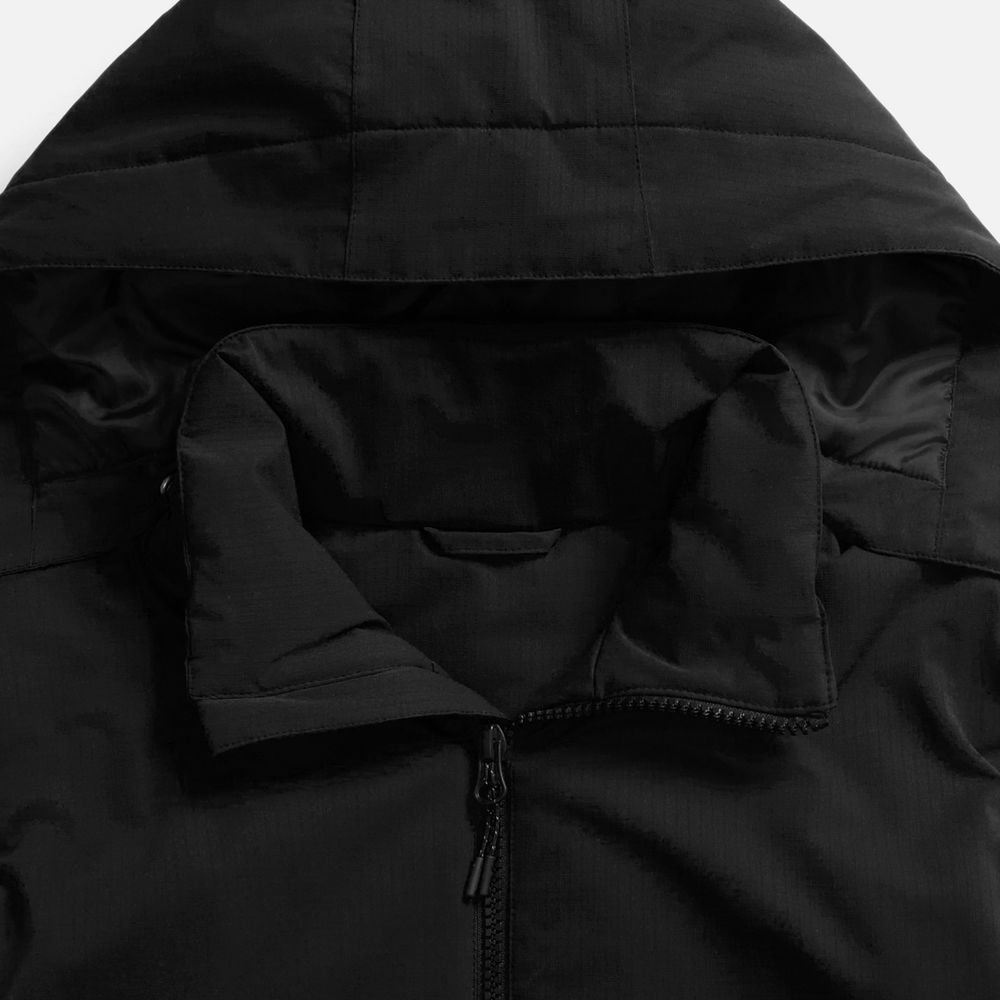 - Отстегивающийся капюшон с утяжкой и кнопками для плотного прилегания и защиты горла