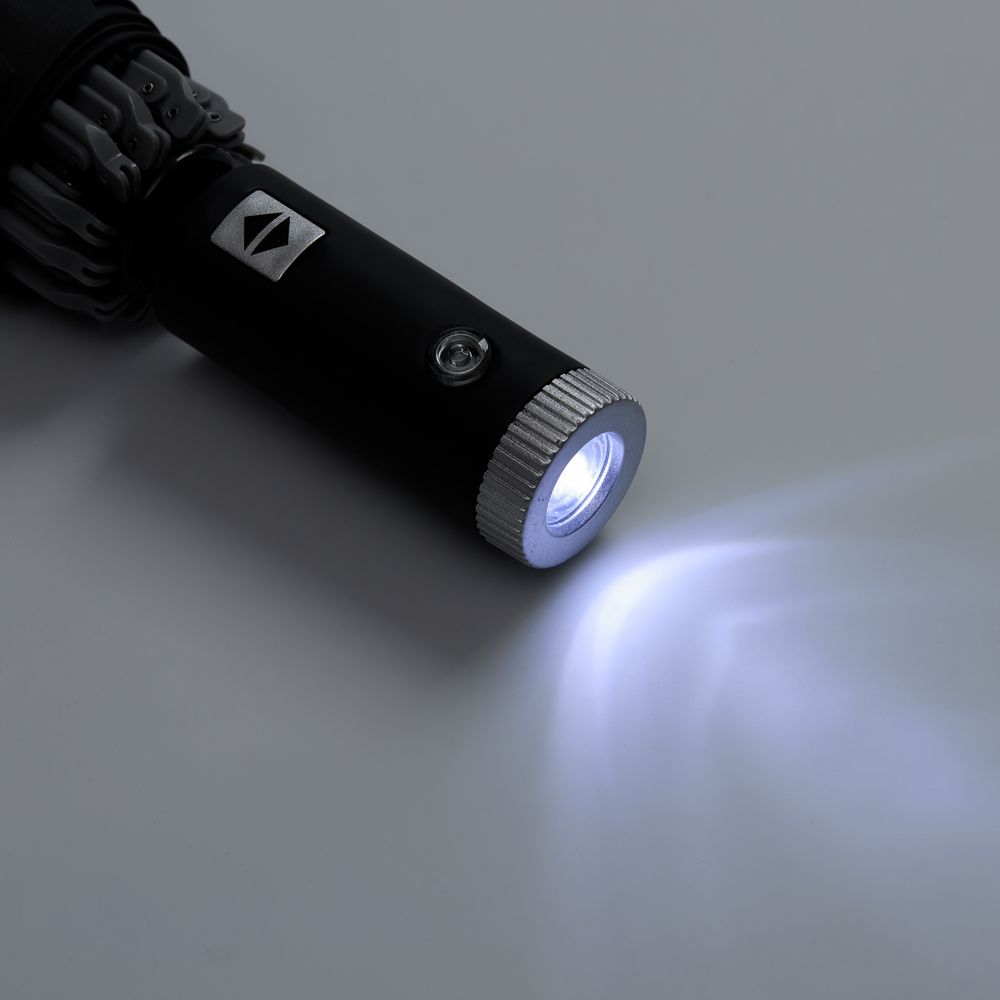 Светодиодный фонарик, встроенный в ручку зонта, позволит ориентироваться в темноте и не наступить в лужу. Светоотражающий кант по куполу сделает вас видимыми для водителей, превращая зонт в активный элемент безопасности на ночных улицах.