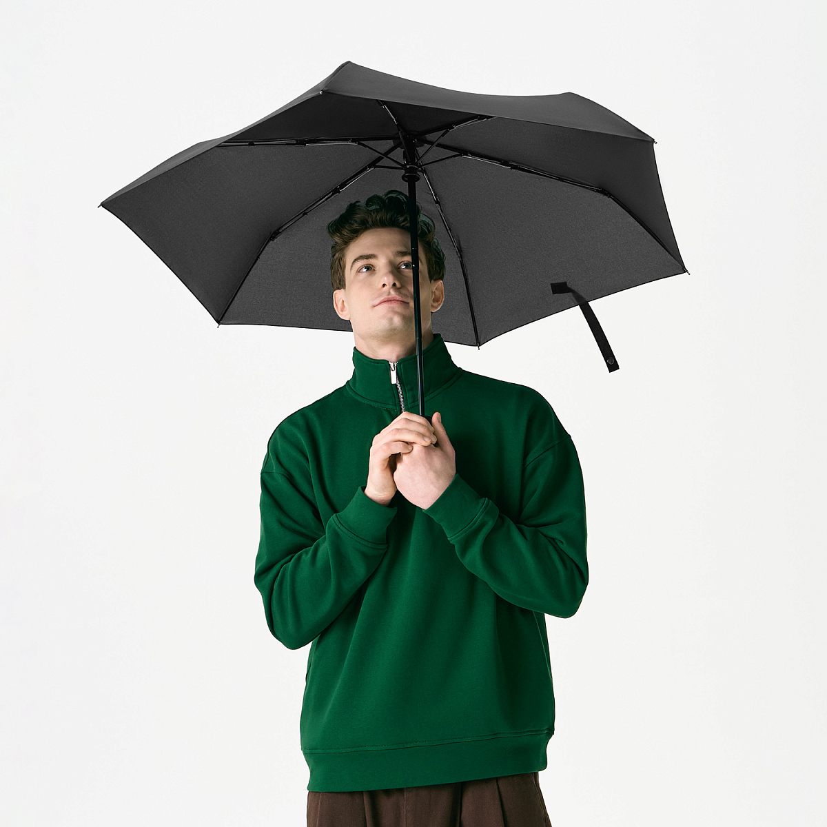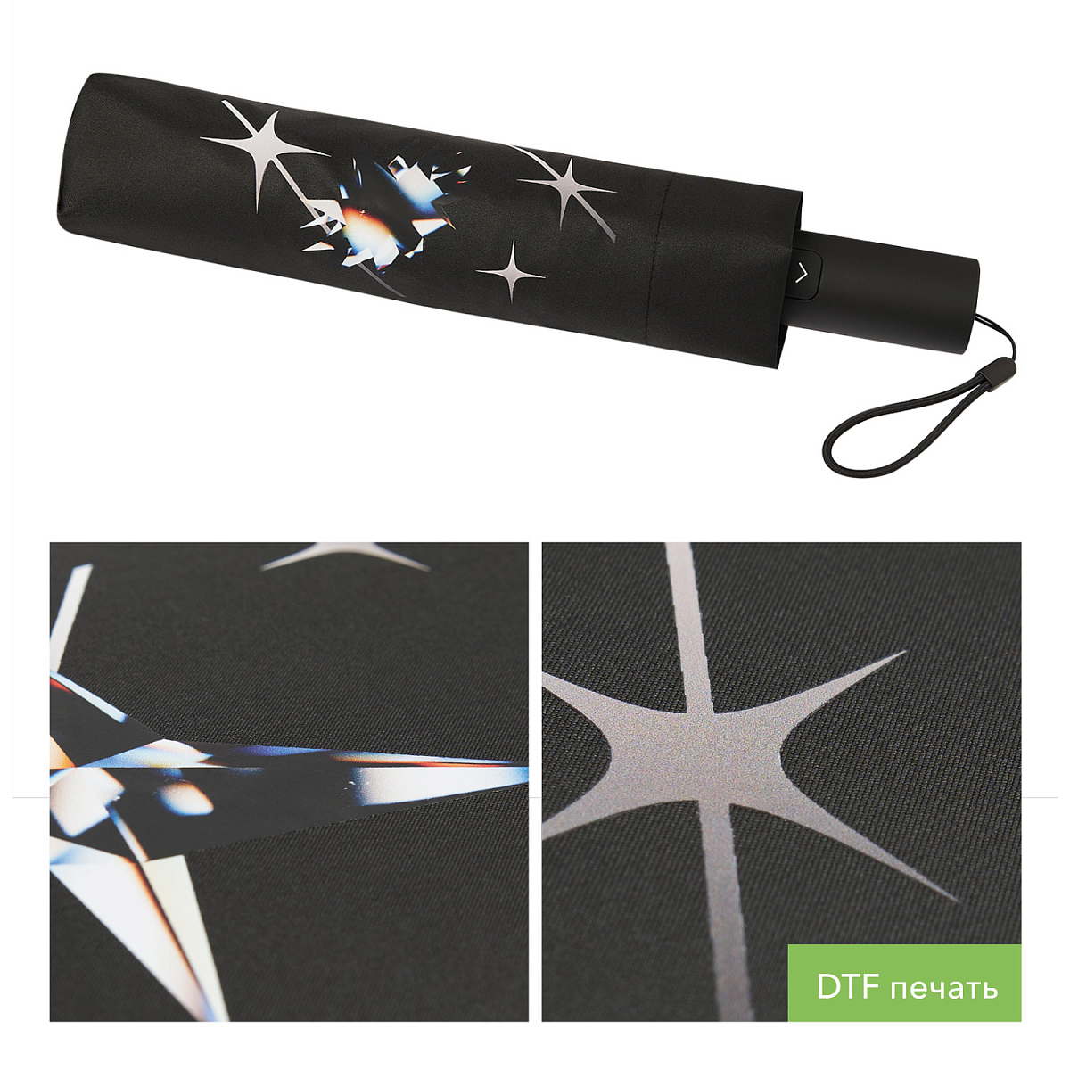 Материал купола – эпонж 190T – обладает высокой износостойкостью и быстро сохнет. Чехол, идущий в комплекте, и эластичная петля на ручке дарят еще больше удобства при пользовании. PU-покрытие на ручке зонта обеспечивает комфортное и долговечное использование аксессуара: оно устойчиво к истиранию, не скользит в руке и не становится липким.