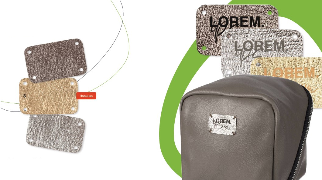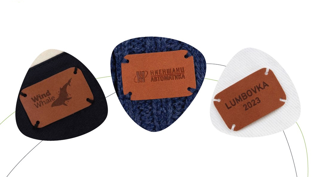 - Кожаные лейблы. Бывают из натуральной и искусственной кожи. Так как кожа плохо переносит влагу, их располагают на вещах, которые редко стирают: домашнем текстиле, верхней одежде. Логотипы наносят методами тиснения, лазерной гравировки.