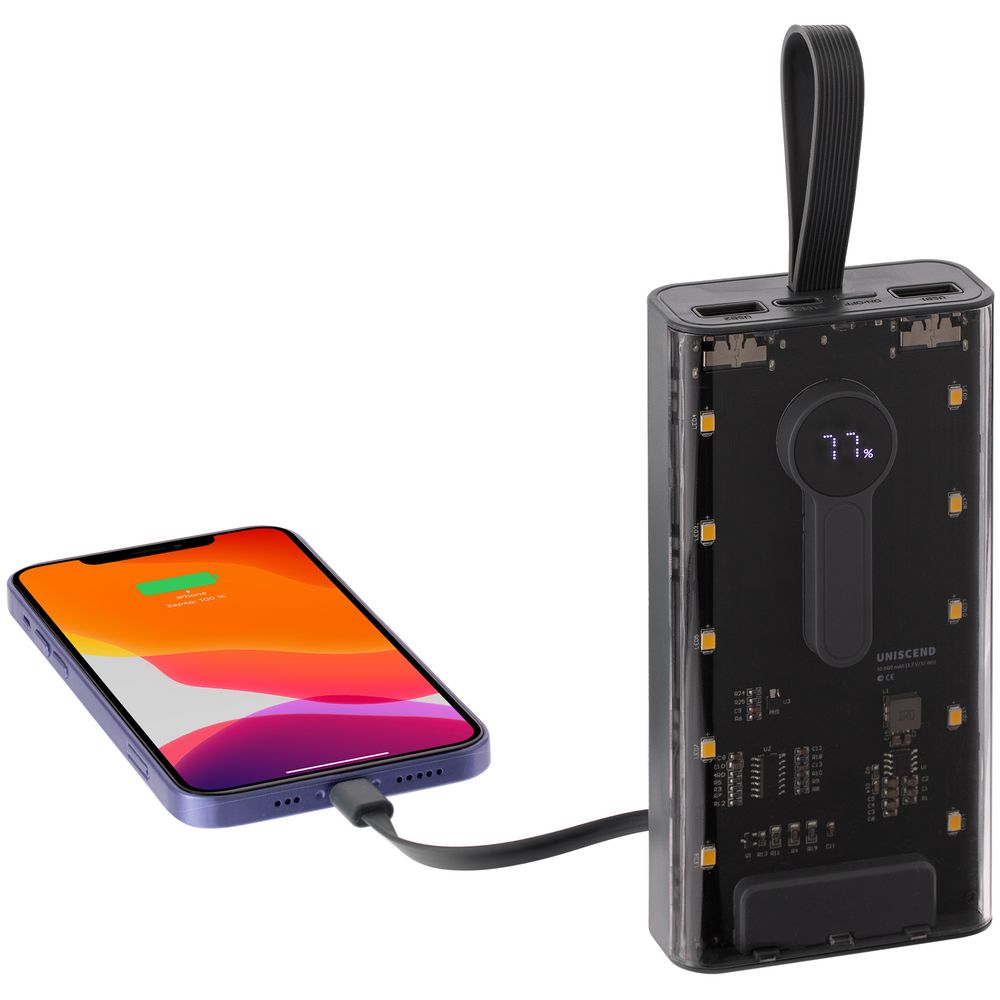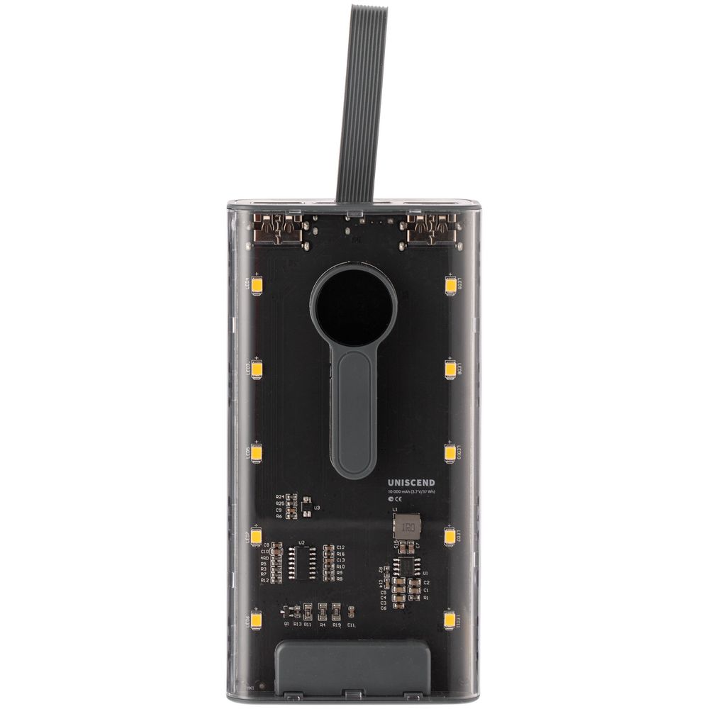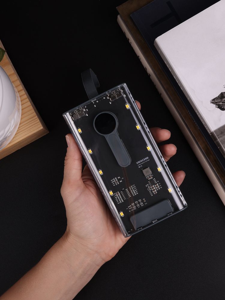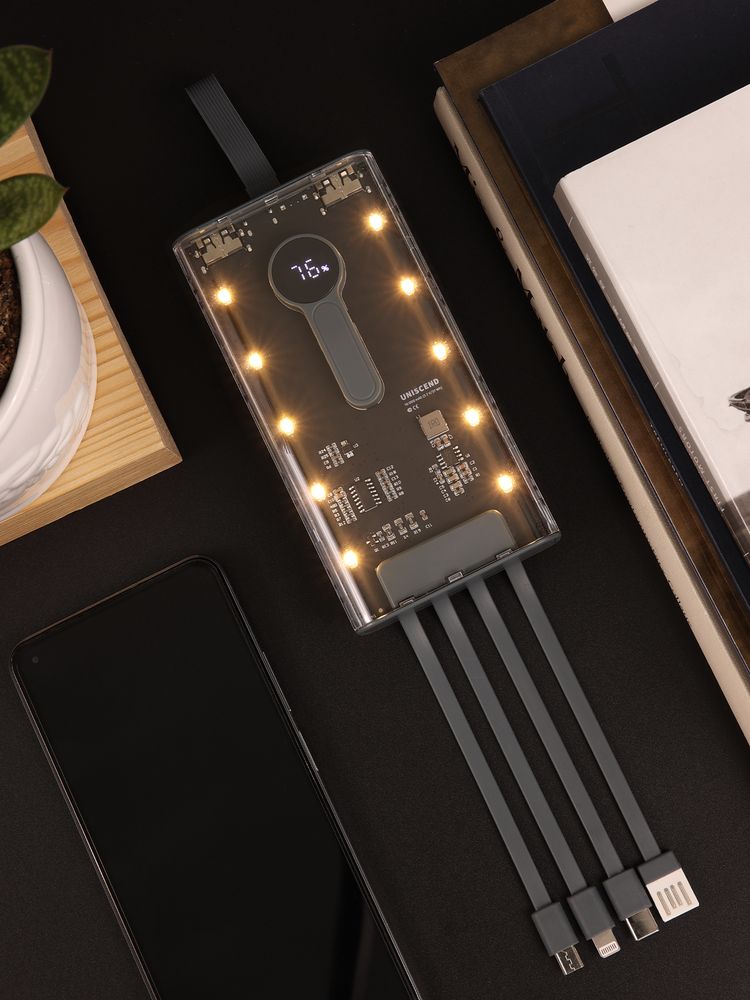 Необычный дизайн коллекции Uniscend Trellis выгодно выделяет новую серию устройств из прозаичного ряда внешних аккумуляторов. Они не поддерживают беспроводную зарядку, зато точно привлекают внимание: под прозрачной панелью хорошо видны электронная начинка и цифровой индикатор оставшегося в аккумуляторе заряда, а мягкая светодиодная подсветка теплого оттенка дополняет технологичный внешний вид.