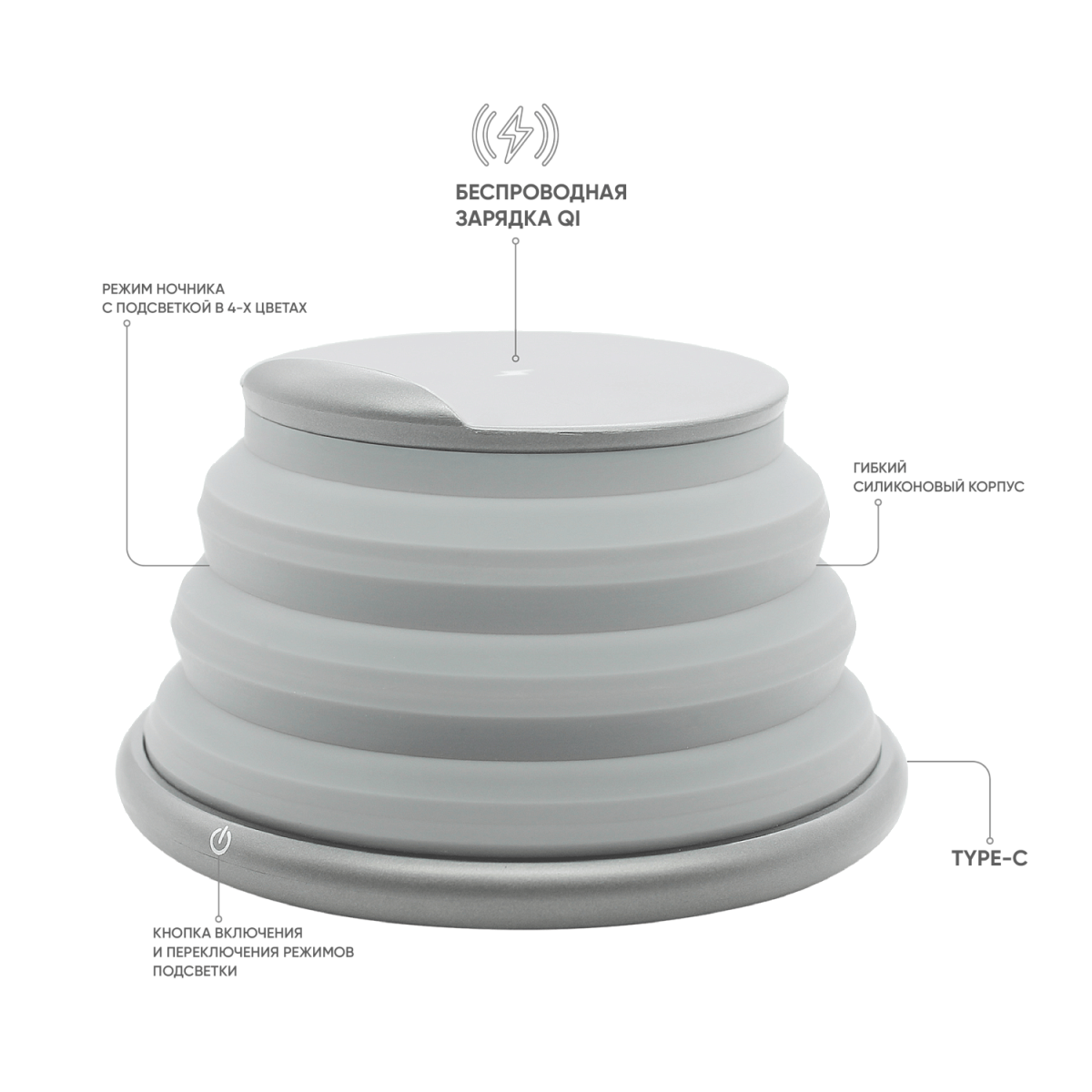 Устройство 2 в 1: Беспроводная зарядка по стандарту Qi и ночник с подсветкой в 4-х цветах.