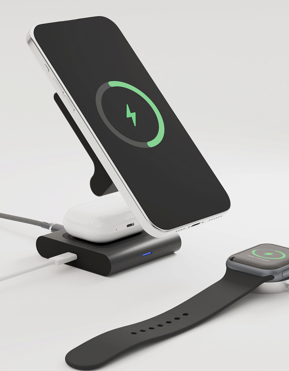 Особенности: заряжает 3 устройства одновременно: беспроводная зарядка для 2-х устройств, 1 устройство подключается через кабель; компактная складная конструкция; индикация работы; поддержка MagSafe