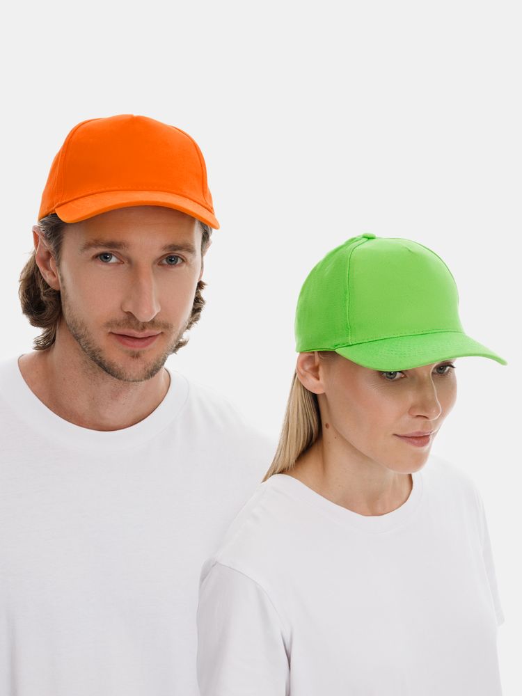 Модель бейсболки с 5-ю клиньями без лобового шва из плотного чесаного хлопка.