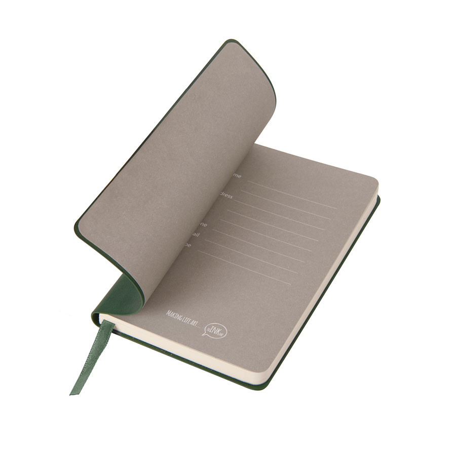 Блокнот с мягкой термоактивной обложкой и популярной комбинацией цветов Термоактивный PU материал Velvet Цвет обложки, близкий к Pantone 3435С Цвет форзаца, близкий к Pantone Cool Gray 5U Внутренний блок 192 страницы в клетку Идеально скругленные углы блока Перфорированные 8 последних листов Кремовая FSC бумага 70 г м2 Ляссе в тон обложки Фирменный сливбокс thINKme
