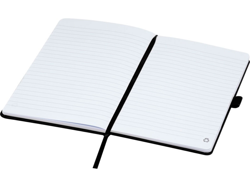 Блокнот формата А5 с обложкой из переработанного ПЭТ. Содержит 80 листов в линию плотностью 70 г/м², изготовленных из переработанной бумаги, с петлей для ручки и лентой-закладкой. Может быть дополнен шариковой ручкой Honua 107757 из переработанного ПЭТ. Переработанный PET пластик. FSC Recycled 100% P7 CU-COC-877277.