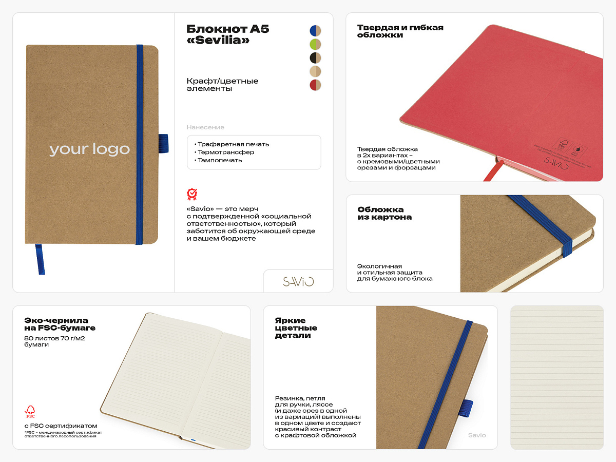 Sevilia от Savio — блокнот с твердой обложкой из крафта, закрывающийся на вертикальную резинку. Для удобства использования предусмотрены ляссе и петелька для ручки, совпадающие по цвету с резинкой.