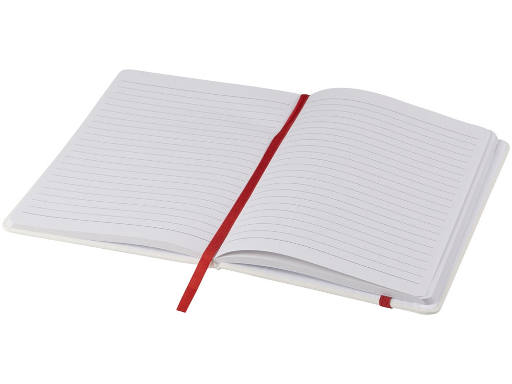 Белый блокнот A5 с цветной эластичной закладкой и резинкой. 96 страниц (60g/m2), линованная бумага. На обложке возможна цифровая печать.