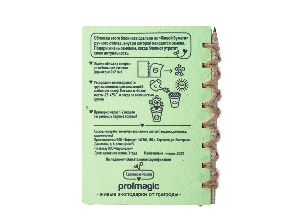 Живой Блокнот - это блокнот ручной работы с семенами цветов внутри обложки. Блок на 50 листов сделан из экологичной неотбеленной бумаги, вместо пружины используется льняной шпагат. Блокнот поставляется с бумажным карандашом в наборе. После использования блокнота, вырвите обложку, порвите ее на кусочки и посадите в землю. Поливайте, и уже через несколько недель вы увидите первые всходы.