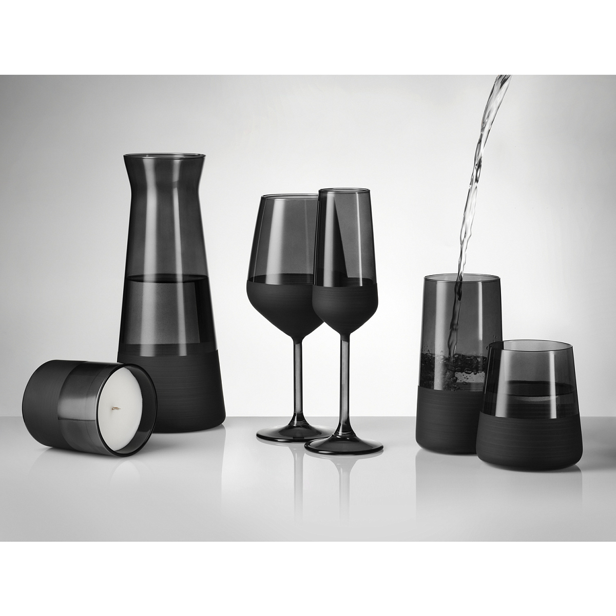 Бокалы для вина и шампанского, стаканы для воды, свечи в стеклянных подсвечниках представлены в едином дизайнерском решении, поэтому вы обязательно создадите подходящий набор для себя.