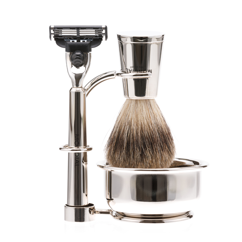 Бритвенный набор Mondial: станок, помазок, чаша, подставка; отполированный никель можно заказать в нашей компании по самой доступной цене от 29 270 рублей.