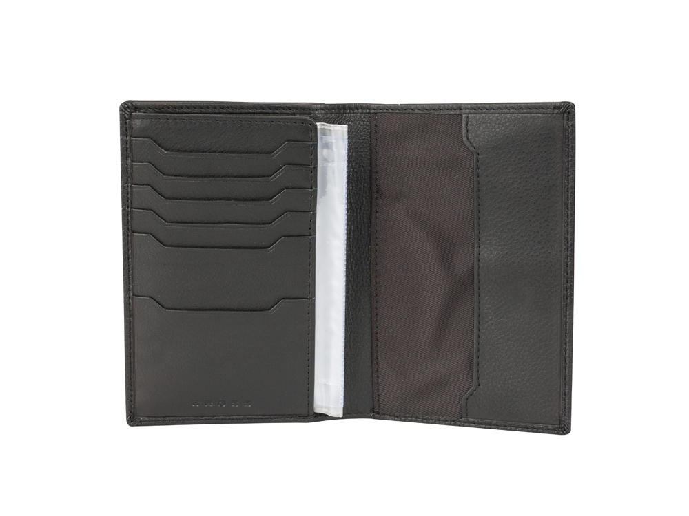 Бумажник для документов включает в себя: одно отделение для банкнот, шесть отделений для кредитных карт, три универсальных кармана для документов, в том числе паспорта.