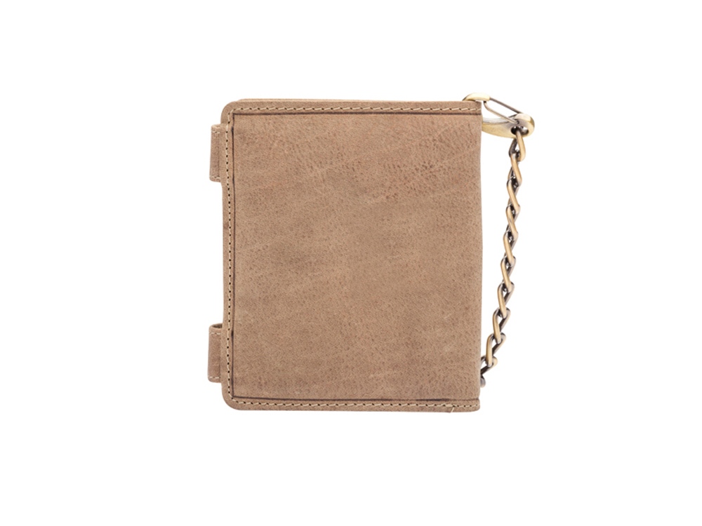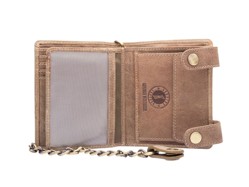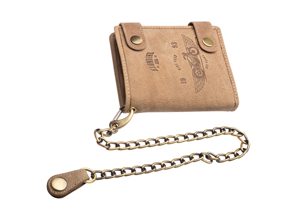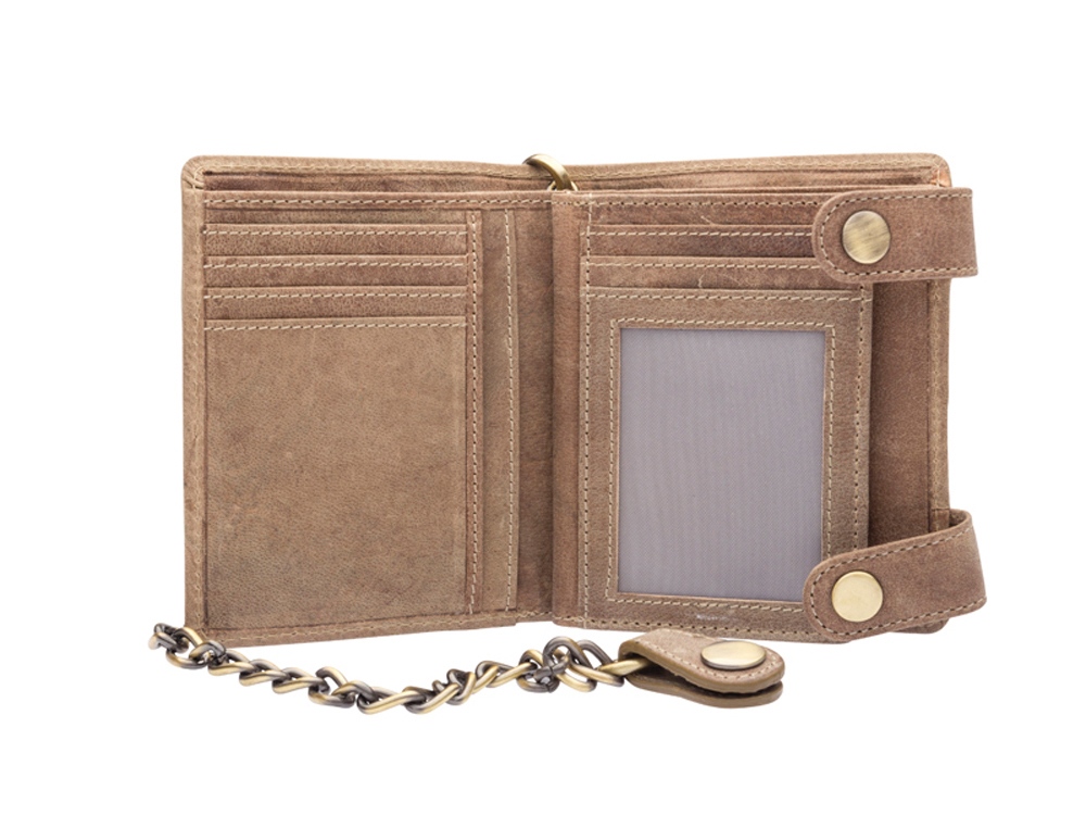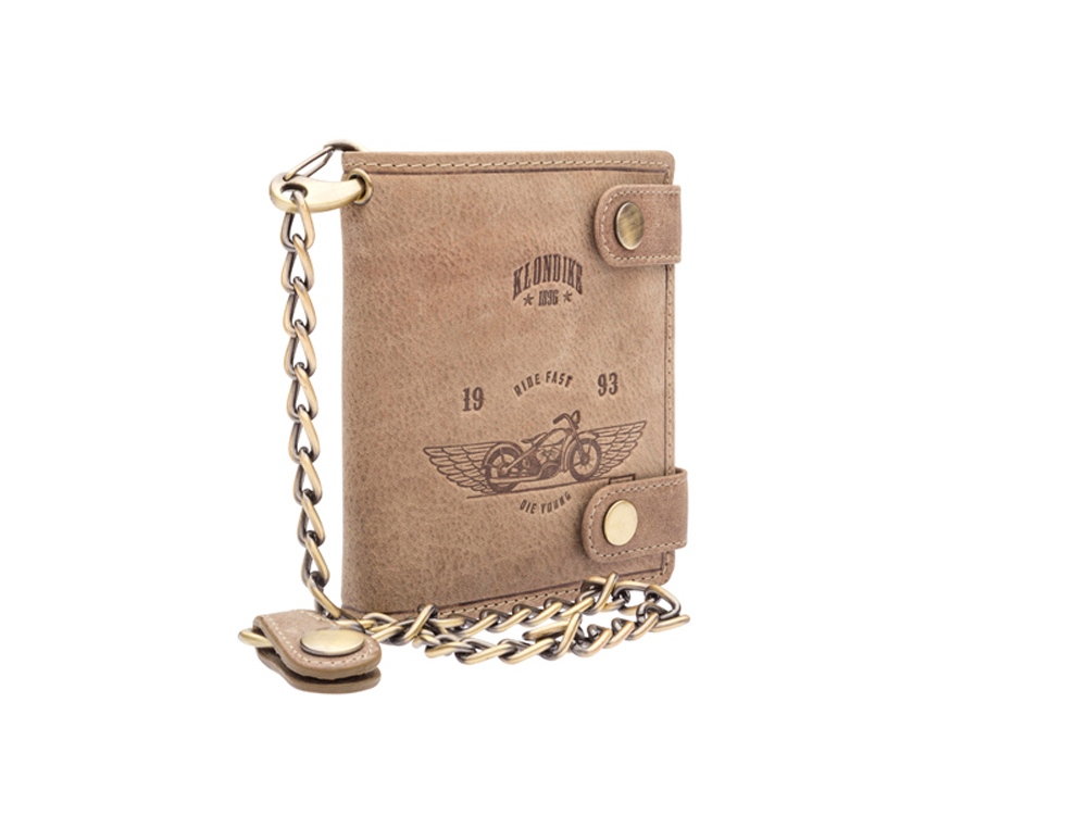 Бумажник мужской Tim Bike с металлической цепью и тиснением в виде мотоцикла, закрывается на 2 заклепки, включает в себя отделений для кредитных карт, два отделение с прозрачным окошком, три скрытых отделения, одно дополнительное скрытое отделение на молнии, два отделения для купюр, позволяющие хранить купюры в развернутом виде, одно отделение для монет, закрывается на кнопку.