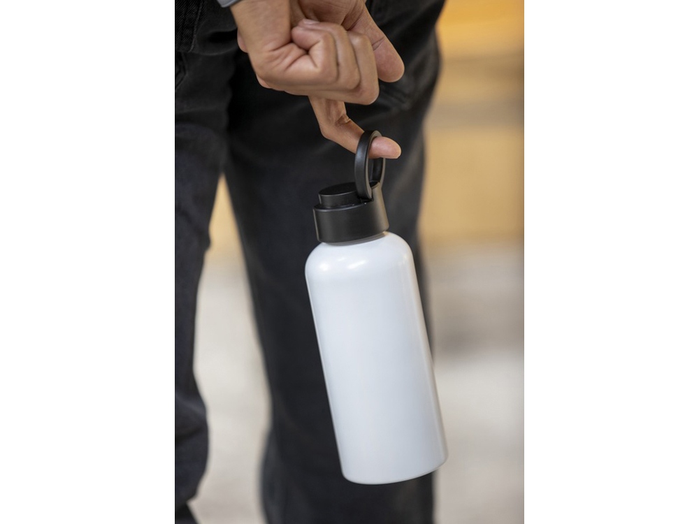 Бутылка для воды из переработанного алюминия, сертифицированного согласно RCS, с элегантным дизайном. Имеет крышку из переработанного пластика с отдельной петлей для переноски. Легкая и удобная для переноски. Объем: 600 мл. Recycled Aluminium, Recycled PP Plastic.