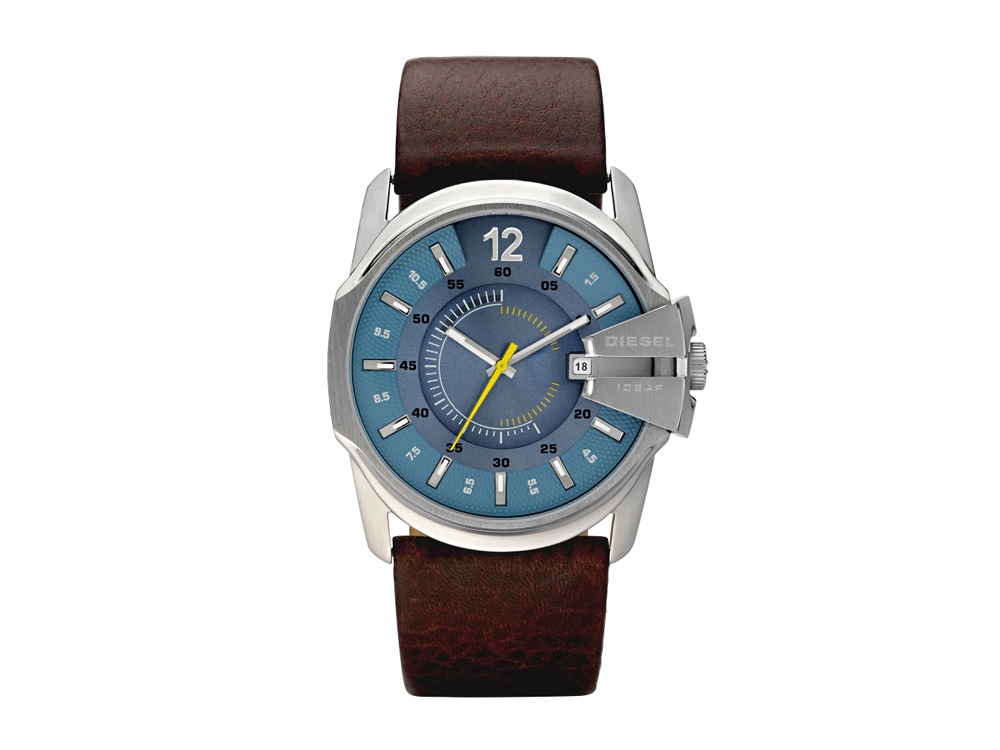 Товар представлен в следующем цвете: Корпус- серебристый, циферблат- синий, крепление- коричневый