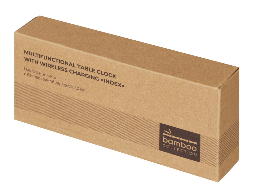 Настольные часы с корпусом из бамбука, имеют функцию беспроводной зарядки для смартфонов (10 Вт). Яркий дисплей. Функция измерения температуры окружающей среды.
