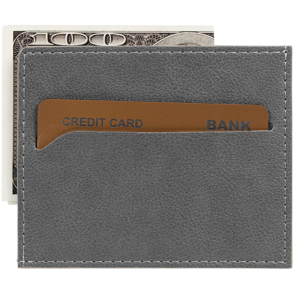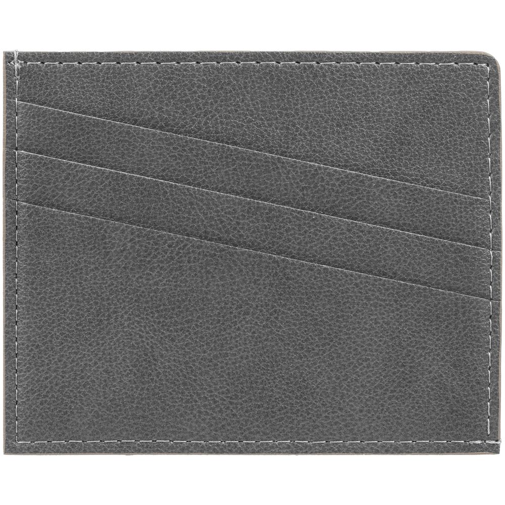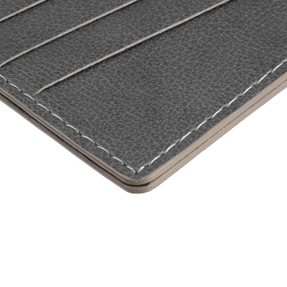 Чехол выполнен из материала Petrus, серый СС, дополнен окрашенным срезом края и внутренним карманом из серого картона. Имеет 4 отделения для кредитных карт и 1 отделение для купюр.