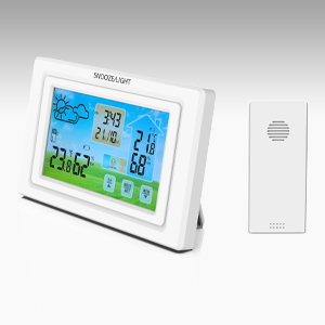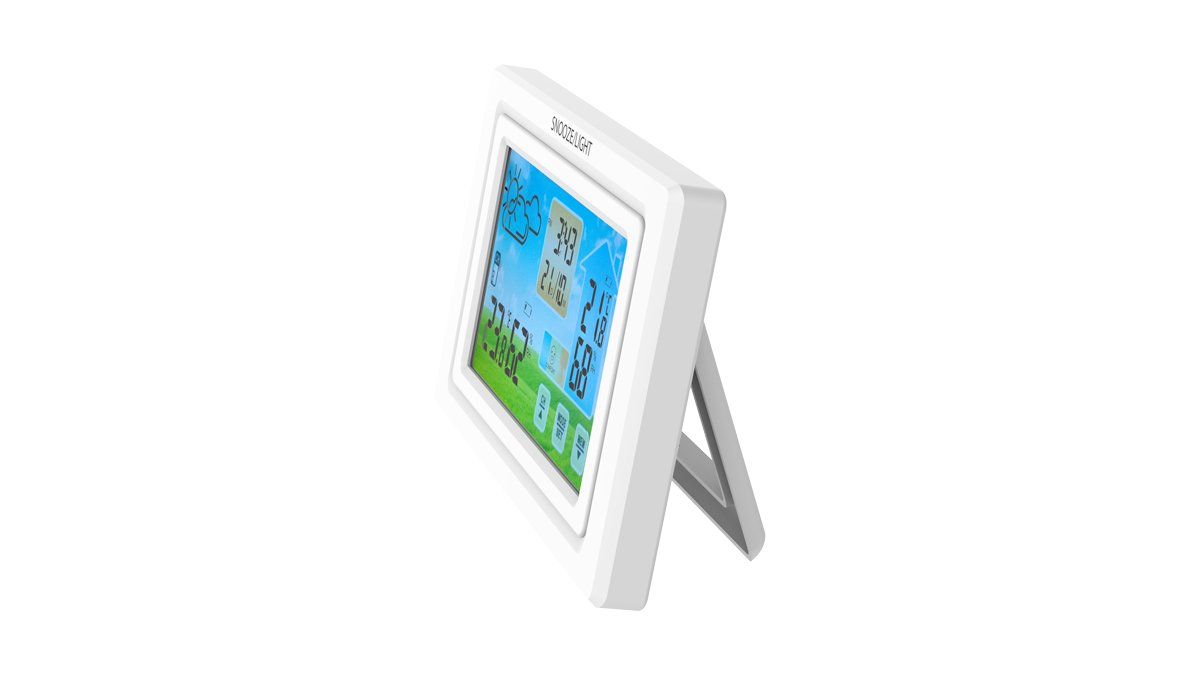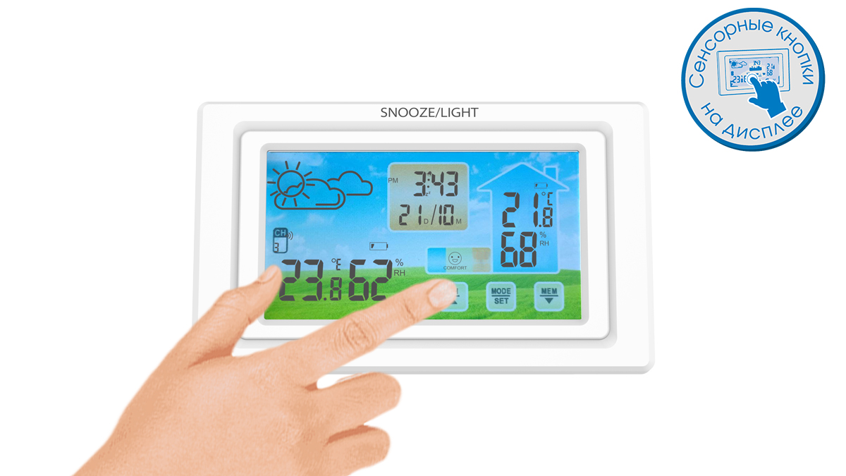 Особенности: сенсорные кнопки на экране; внешний датчик температуры и влажности; цифровой термометр; гигрометр (% влажности); пиктограмма погоды (солнечно, облачно, пасмурно, дождь); часы с будильником и календарь; комнатный датчик влажности; режим «подремать» SNOOZE; ; работа от USB и от батареек