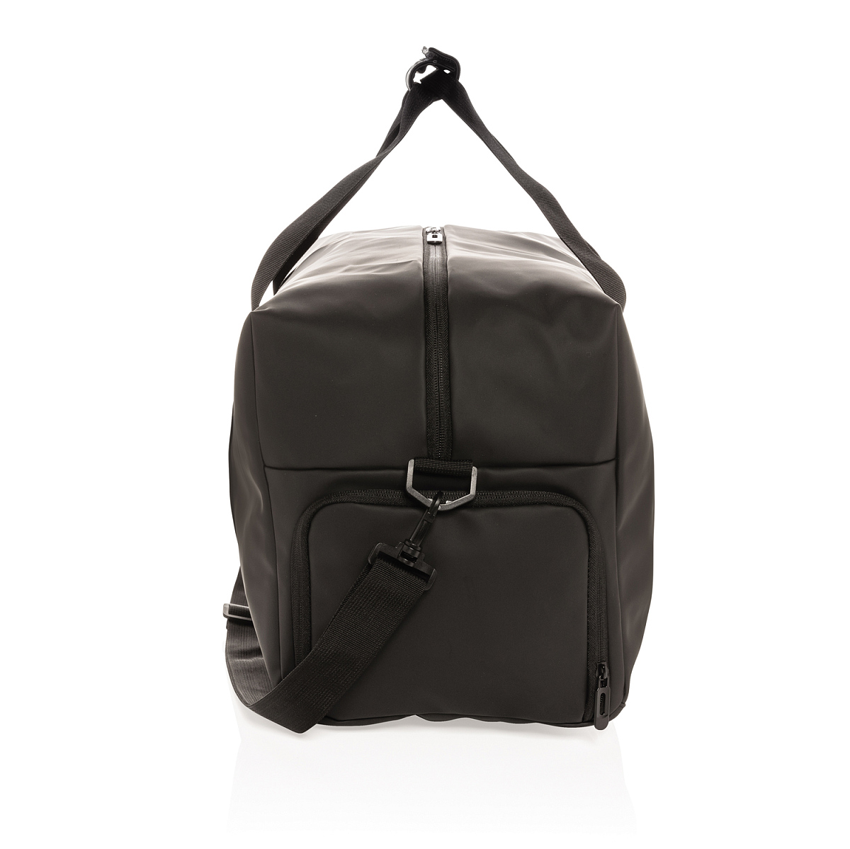 Вместительная сумка подойдет как для небольших поездок, так и для походов в спортзал. Минималистичный дизайн, для хранения предусмотрено большое отделение, внешний и внутренний карманы. Сбоку есть специальный отсек для обуви. Сумку можно носить через плечо при помощи длинного ремня или в руках при помощи прочных ручек. Снаружи — 100% полиуретан, внутри — полиэстер 210D. Не содержит ПВХ. Длина 50 см., ширина 25 см., высота 28 см., диаметр 0 см.