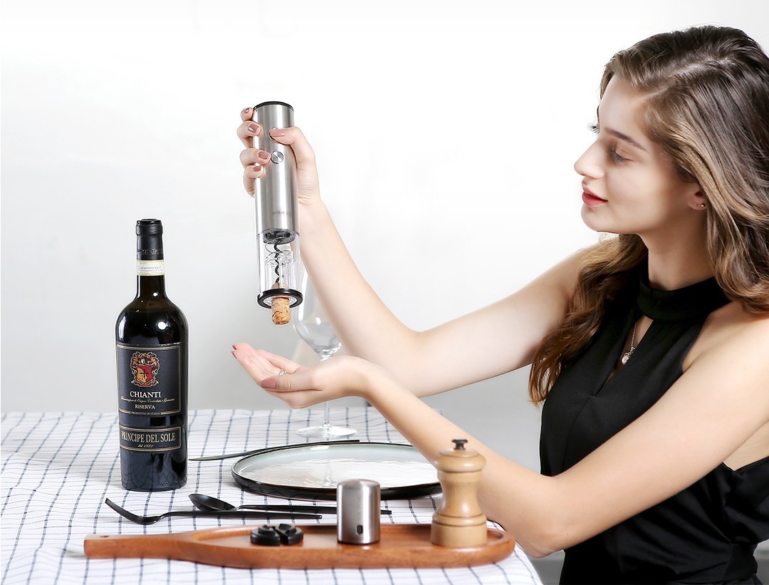 Особенности: мощный электромотор на промышленных подшипниках, шестерни из бронзового сплава, мощная сила кручения шпинделя штопора позволяют всего за 6 секунд справиться с пробкой любой прочности, открывая бутылку с вином, продуманная конструкция позволяет не нагревать и не взбалтывать вино, предупреждая попадание крошек в бутылку, просто выровняйте бутылку по вертикали, нажмите кнопку открытия и плотно прижмите штопор к бутылке