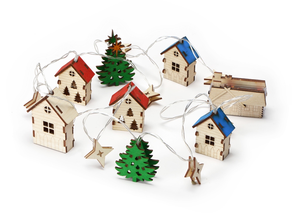 Комплектность: домик- 5 шт., елочка- 2 шт., звездочка- 8шт., лампочка (горит желтым цветом)- 15шт.