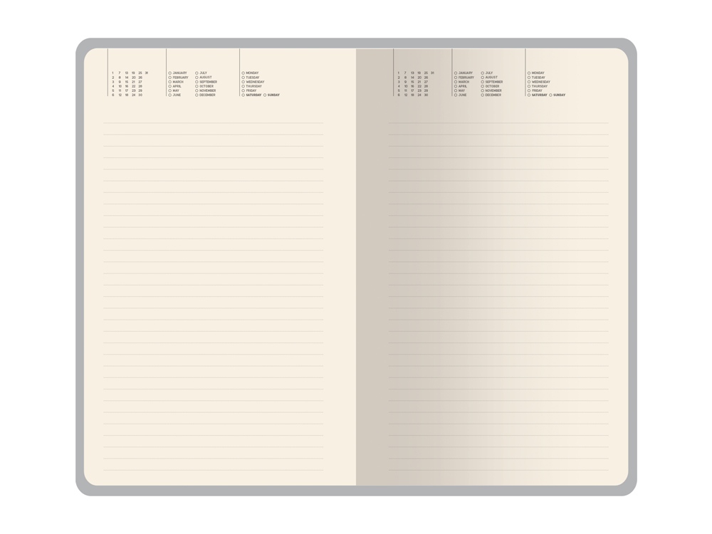 Внутренний блок изготовлен из бежевой бумаги плотностью 80 г/кв.м и содержит 128 листов в серую линейку.