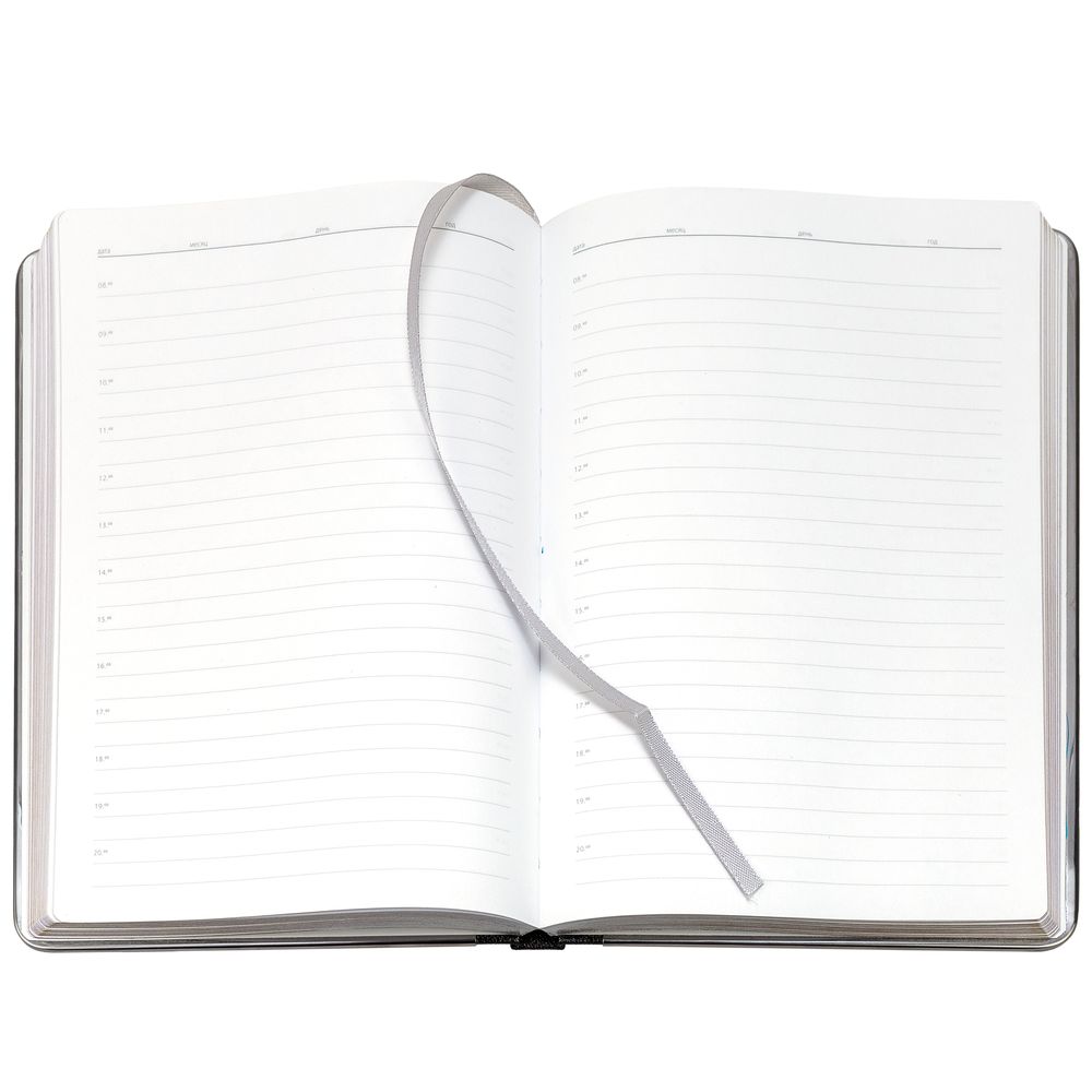 Ежедневник с твердой обложкой и серебристым обрезом, выполнен из материала Saffian, темно-серый, дополнен серым ляссе и металлическими рамками.