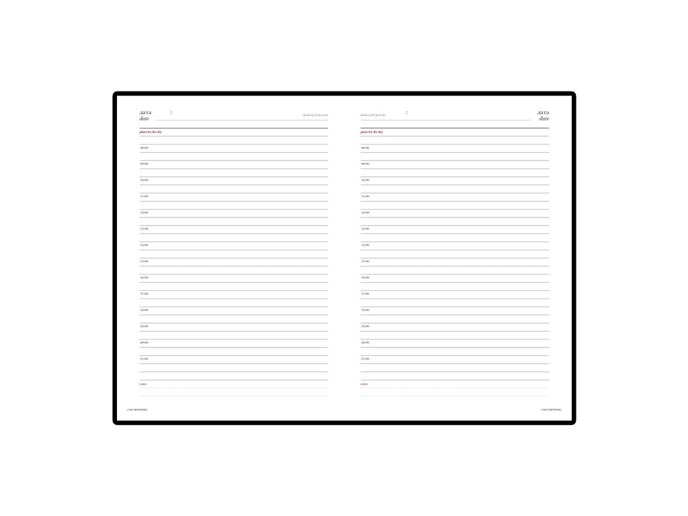 Две строчки на каждой странице отведены на ежедневное планирование. Есть почасовая разбивка страниц. Две последние строчки служат для комментариев. Строгий классический материал, прекрасная практичная альтернатива дорогостоящей натуральной коже. Идеально сочетается с тиснением фольгой.